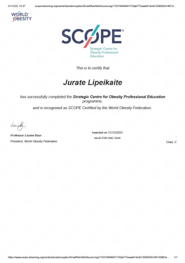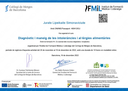 ¿Cuáles son las principales especialidades de Jurate Lipeikaite Simonaviciute?Jurate Lipeikaite Simonaviciute es médica general. Te mostramos algunos de los servicios que ofrece gracias a su trayectoria y amplia experiencia: Dieta personalizada, Dieta Pronokal, Consulta online, Tratamiento para la obesidad, Tratamientos para el sobrepeso y la obesidad, Primera visita nutrición, Nutrición y dietética, Nutrición en enfermedades crónicas, Diagnóstico y tratamiento de las dislipemias, Asesoramiento Nutricional.