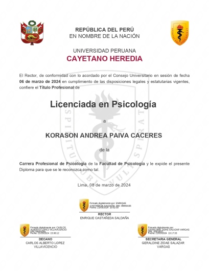 ¿Cuáles son las principales especialidades de Korason Paiva Cáceres?Korason Paiva Cáceres es psicóloga. Te mostramos algunos de los servicios que ofrece gracias a su trayectoria y amplia experiencia: Primera visita Psicología, Psicoterapia, Diagnóstico y tratamiento para trastornos de ansiedad, Estrategias terapéuticas en comunicación y habilidades sociales, Psicoterapia individual, Visitas sucesivas Psicología, Terapia individual, Técnicas y estrategias de autoestima, Visita Psicología, Modificación del estilo de vida.