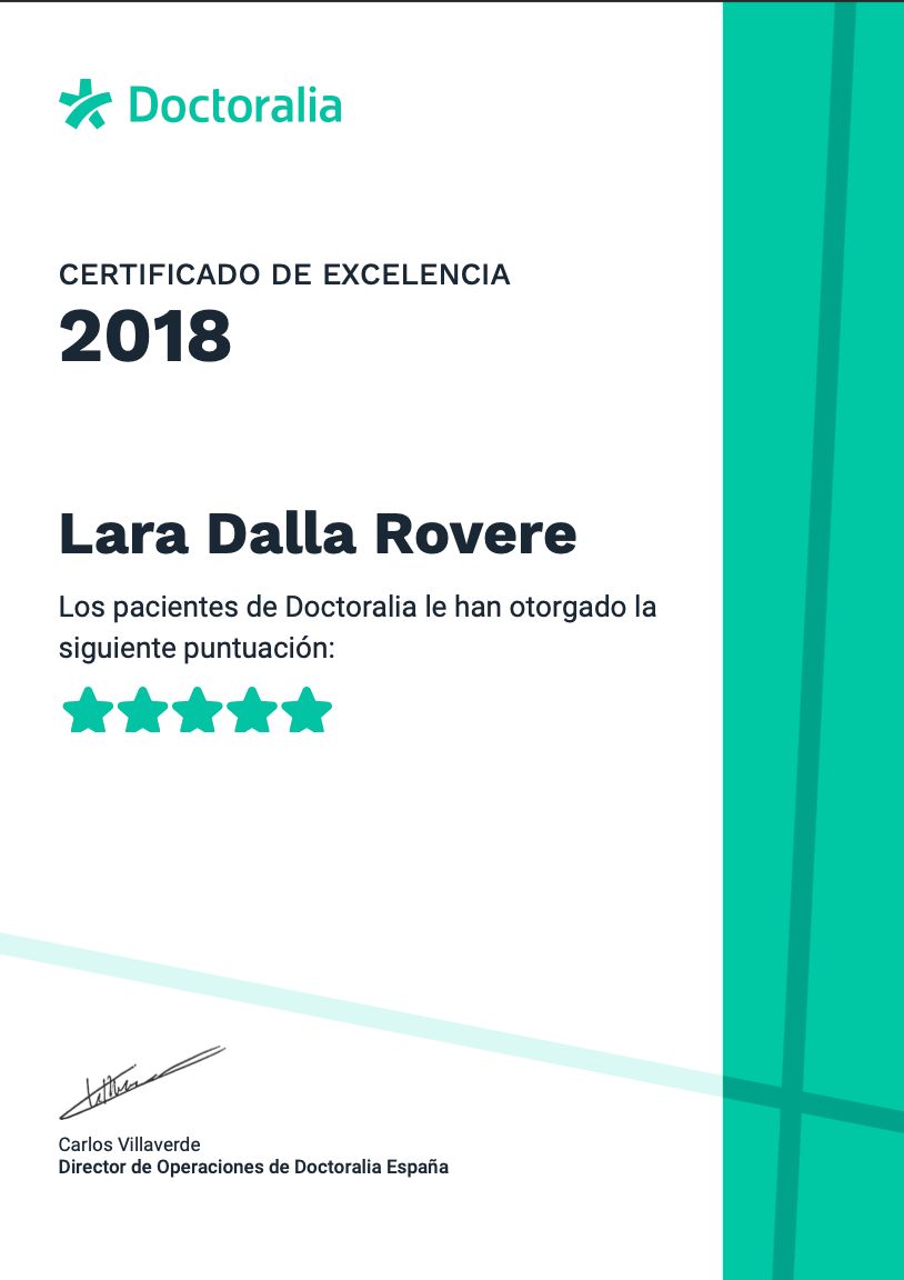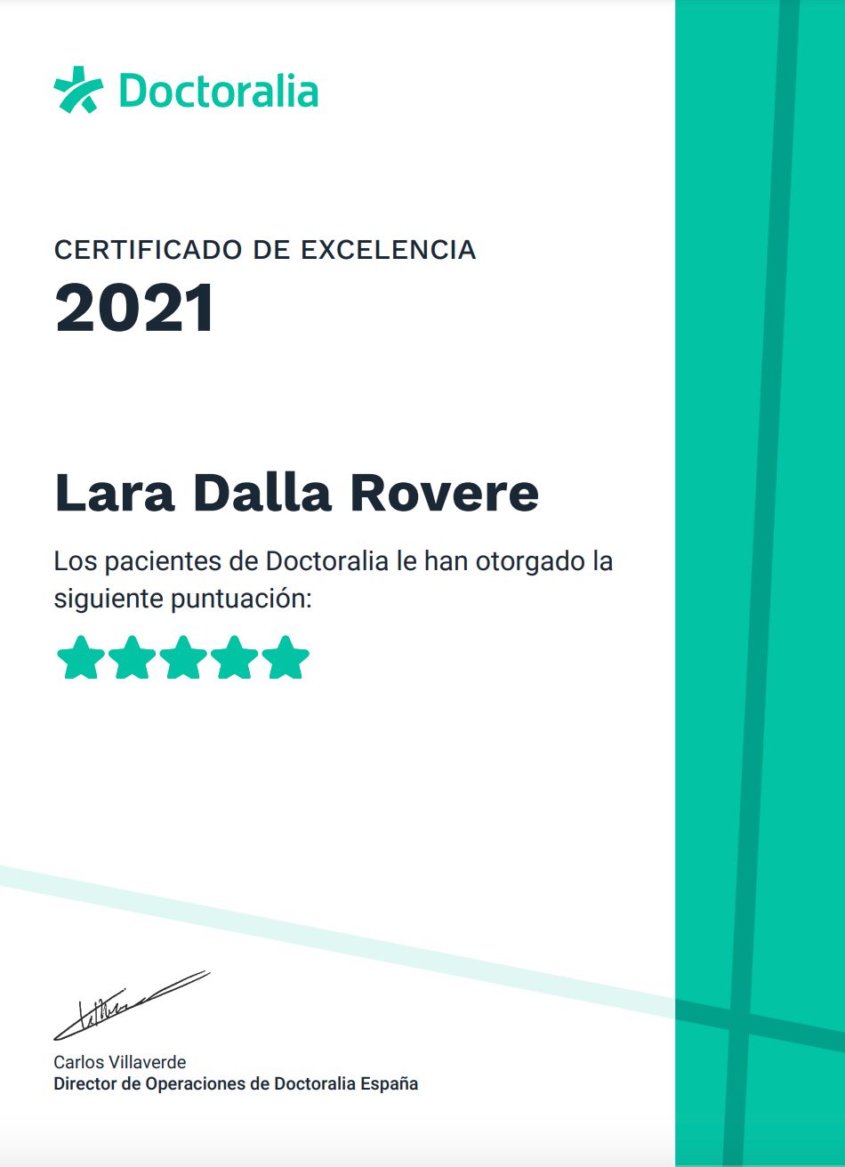 ¿Cómo puedo reservar una cita con Lara Dalla Rovere?El calendario que muestra Lara Dalla Rovere en Doctoralia está actualizado en tiempo real, por lo que solo tienes que elegir qué día y hora te va mejor de entre las disponibles. La reserva es gratuita, y además recibes un recordatorio antes de la visita.