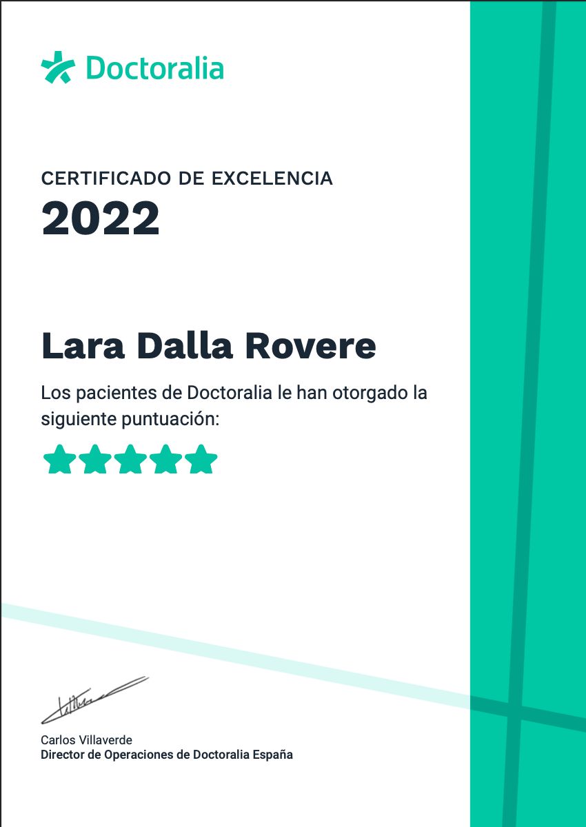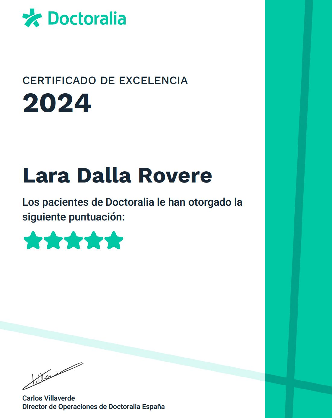 ¿Qué opinan los pacientes de Lara Dalla Rovere?Un total de 261 pacientes han querido dejar una opinión sincera y real sobre Lara Dalla Rovere, otorgándole además una valoración media de 5 estrellas (sobre un máximo de 5).
