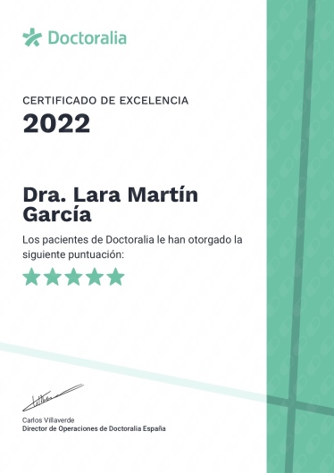 ¿Cómo puedo reservar una cita con Lara Martín García?El calendario que muestra Lara Martín García en Doctoralia está actualizado en tiempo real, por lo que solo tienes que elegir qué día y hora te va mejor de entre las disponibles. La reserva es gratuita, y además recibes un recordatorio antes de la visita.