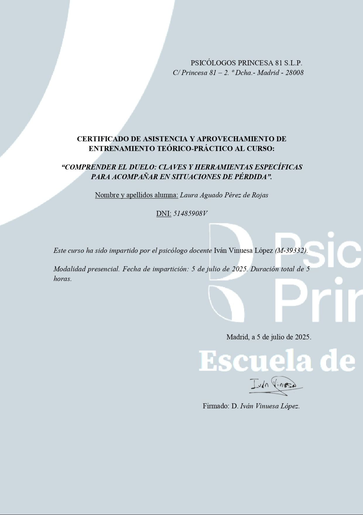 ¿Cuáles son las principales especialidades de Laura Aguado Pérez de Rojas?Laura Aguado Pérez de Rojas es psicóloga. Te mostramos algunos de los servicios que ofrece gracias a su trayectoria y amplia experiencia: Primera visita Psicología, Acompañamiento psicológico en el proceso personal, Visitas sucesivas Psicología, Terapia online, Terapia de duelo, Primera visita Psicología Online, Visitas sucesivas online psicoterapia.
