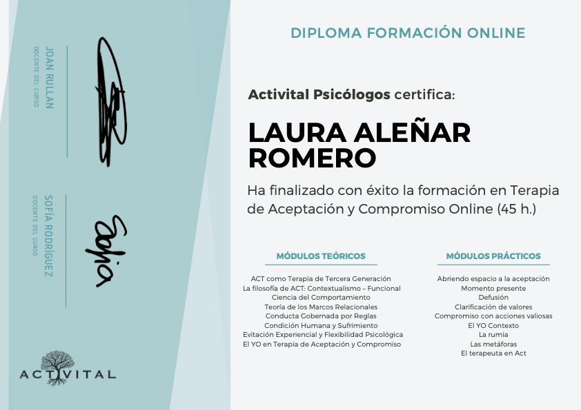 En mi página web: lauraalenarpsicologia.com, también puedes encontrar información sobre los servicios que ofrecemos mi equipo y yo, formación y experiencia.