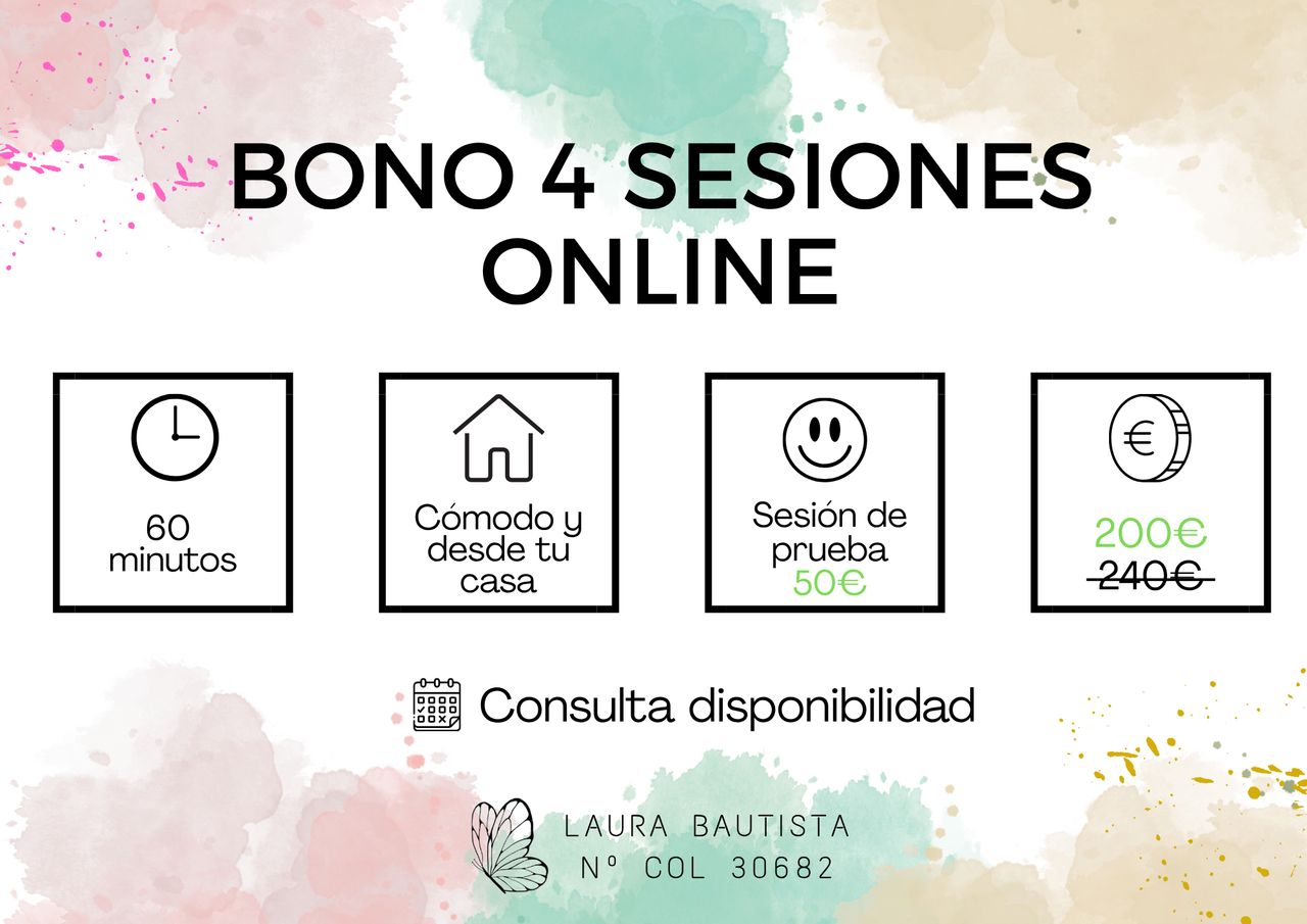 El bono consiste en un total de 4 sesiones de terapia online a gastar en máximo de 6 meses y su precio total es de 200€. De esta manera, el precio de cada sesión se reduce a 50€.