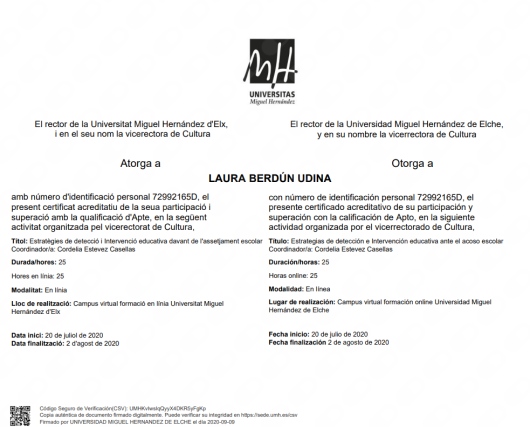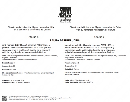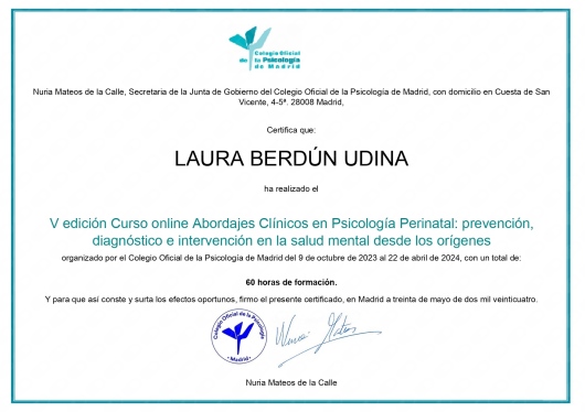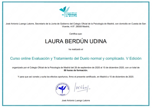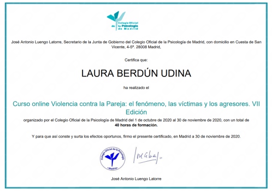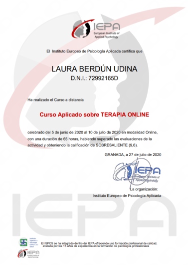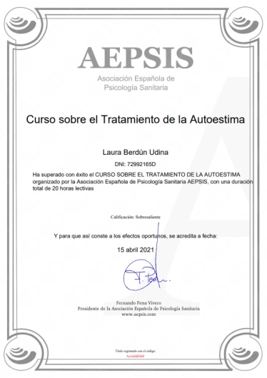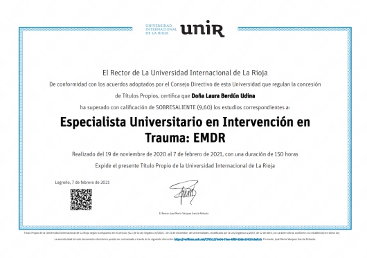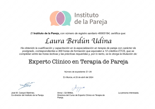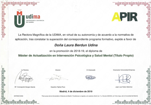 Cuento con títulos de Experto y Especialista en Intervención en Trauma a través de EMDR por la Universidad Internacional de La Rioja (UNIR), Intervención en Trastornos de la Conducta Alimentaria y Obesidad por la Universidad de San Jorge (USJ) e Intervención con Trastornos de la Personalidad por la Asociación Española para el Fomento y Desarrollo de la Psicoterapia.