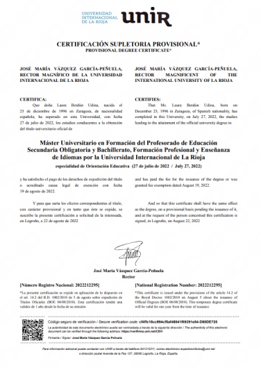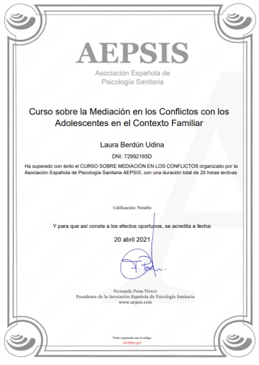 Tengo formación y experiencia en el ámbito de la psicología infantojuvenil con el Máster en Orientación Educativa en la Universidad Internacional de La Rioja (UNIR), con prácticas en un centro concertado de Zaragoza y cursos en Mediación Escolar, Igualdad y Diversidad en el aula, Intervención ante Acoso Escolar, TDAH y Mediación en Conflictos con Adolescentes en el Contexto Familiar.