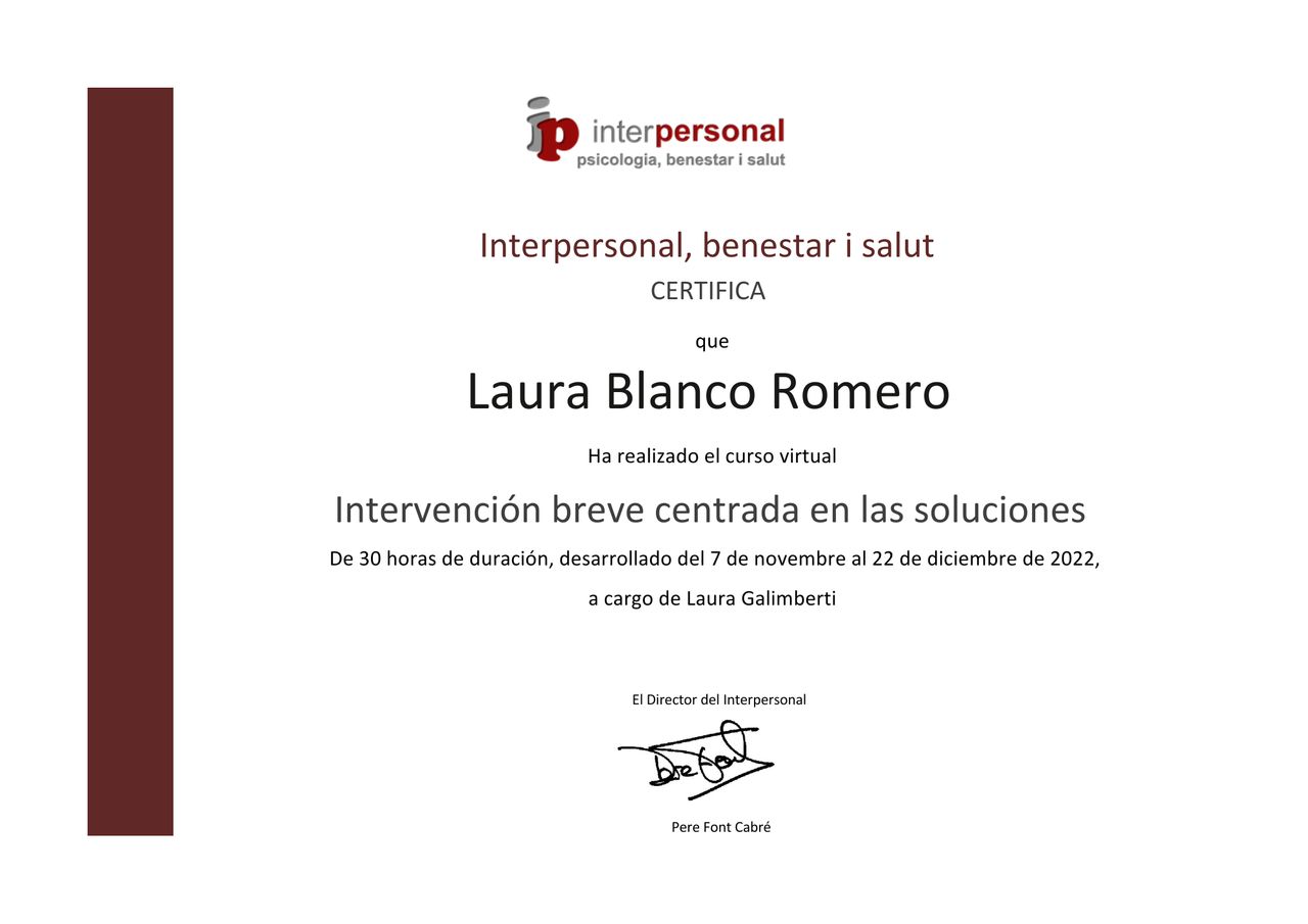 La terapia con Laura me está ayudando muchísimo. Recomendada 100%.