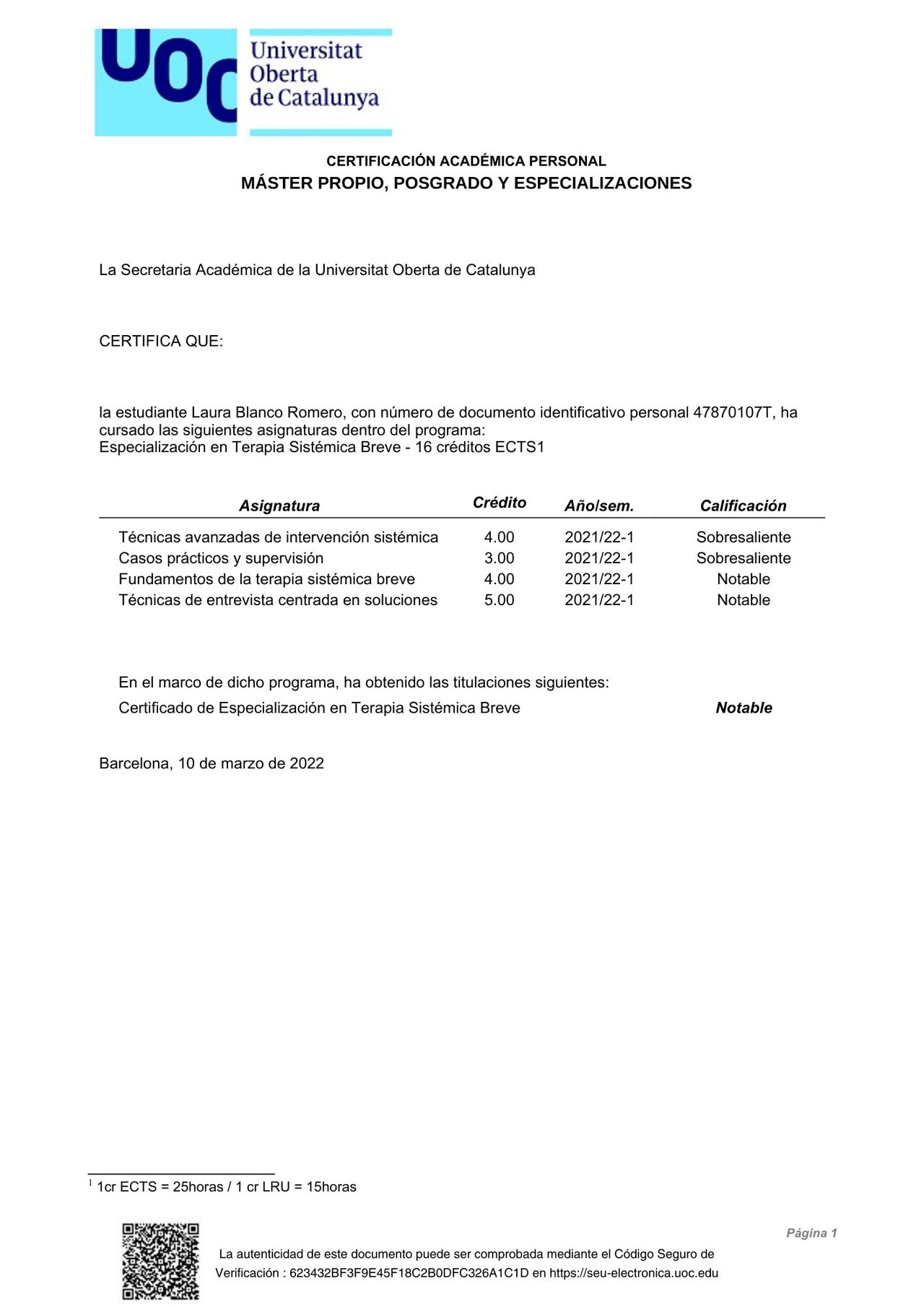 Estoy graduada en Psicología por la UOC y cuento con un Máster en Psicología General Sanitaria por la Universidad Europea. Además, me he especializado en Terapia Sistémica Breve y he desarrollado una formación continua en psicoanálisis en el Espacio Psicoanalítico de Barcelona (EPBCN). Mi experiencia como psicoterapeuta me ha permitido trabajar con diversas problemáticas emocionales como la ansiedad, la dependencia emocional, los trastornos obsesivos y el sufrimiento vinculado a la identidad y las relaciones interpersonales.
