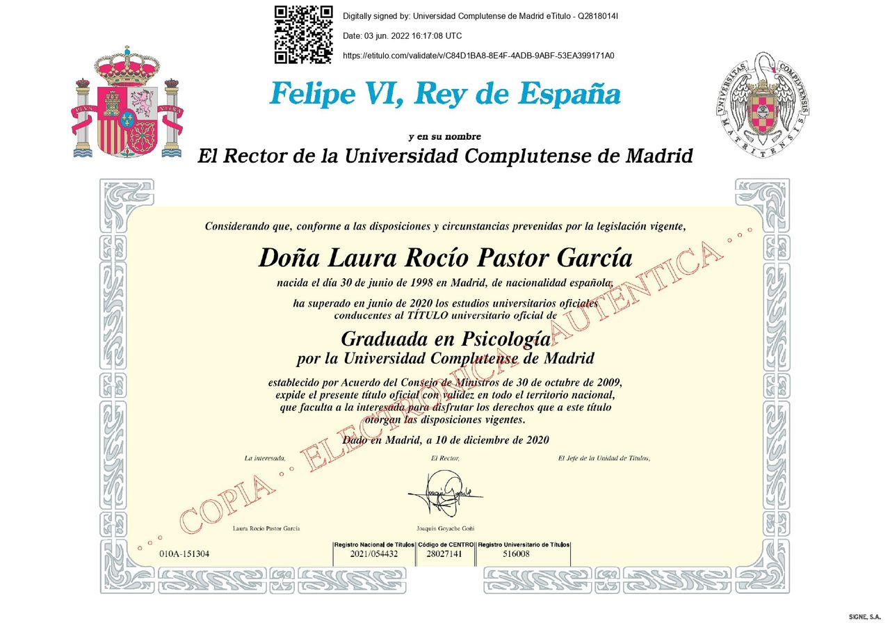 ¿Cuáles son las principales especialidades de Laura Pastor García?Laura Pastor García es psicóloga. Te mostramos algunos de los servicios que ofrece gracias a su trayectoria y amplia experiencia: Primera visita Psicología, Visitas sucesivas Psicología, Coaching personal, Terapia de duelo, Terapia para ansiedad, Terapia grupal Depresión, Tratamiento en autoestima, Tratamiento para el estrés laboral, Tratamiento para fobia social, Consulta online.