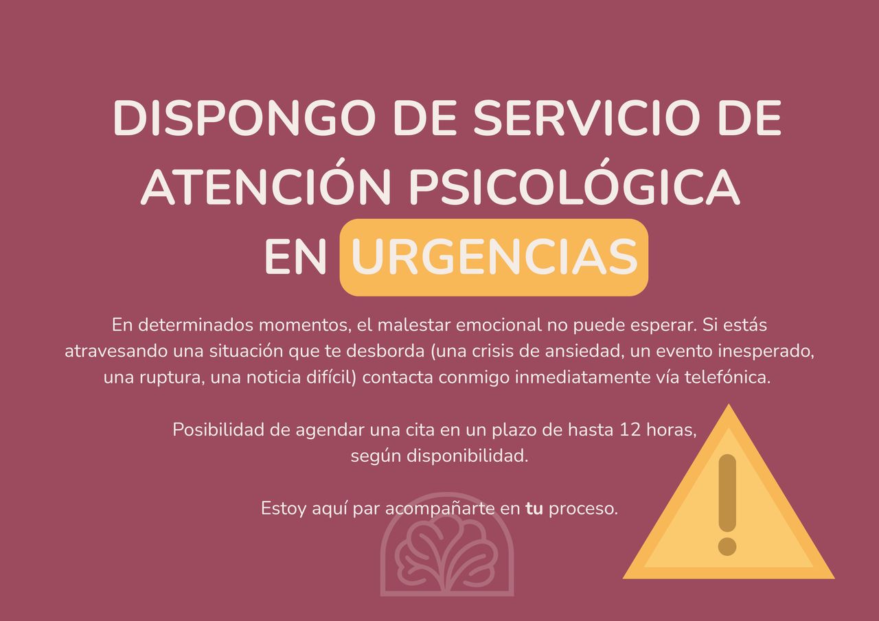 ES: En determinados momentos, el malestar emocional no puede esperar. Si estás atravesando una situación que te desborda (una crisis de ansiedad, un evento inesperado, una ruptura, una noticia difícil) contacta conmigo inmediatamente vía telefónica. Posibilidad de agendar una cita en un plazo de hasta 12 horas,