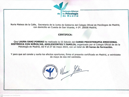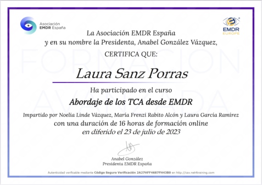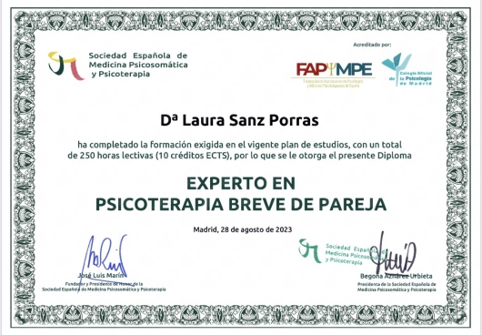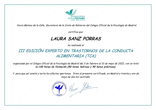 ¿Cuáles son las principales especialidades de Laura Sanz Porras?Laura Sanz Porras es psicóloga, psicóloga infantil. Te mostramos algunos de los servicios que ofrece gracias a su trayectoria y amplia experiencia: Primera visita Psicología, Psicoterapia infantil, Terapia de pareja, Psicoterapia adultos, Psicoterapia de familia, Psicoterapia EMDR, Diagnóstico y tratamiento de los trastornos alimentarios, Gestión de ansiedad ante los exámenes, Primera visita Psicología Infantil, Orientación en la crianza de los hijos.