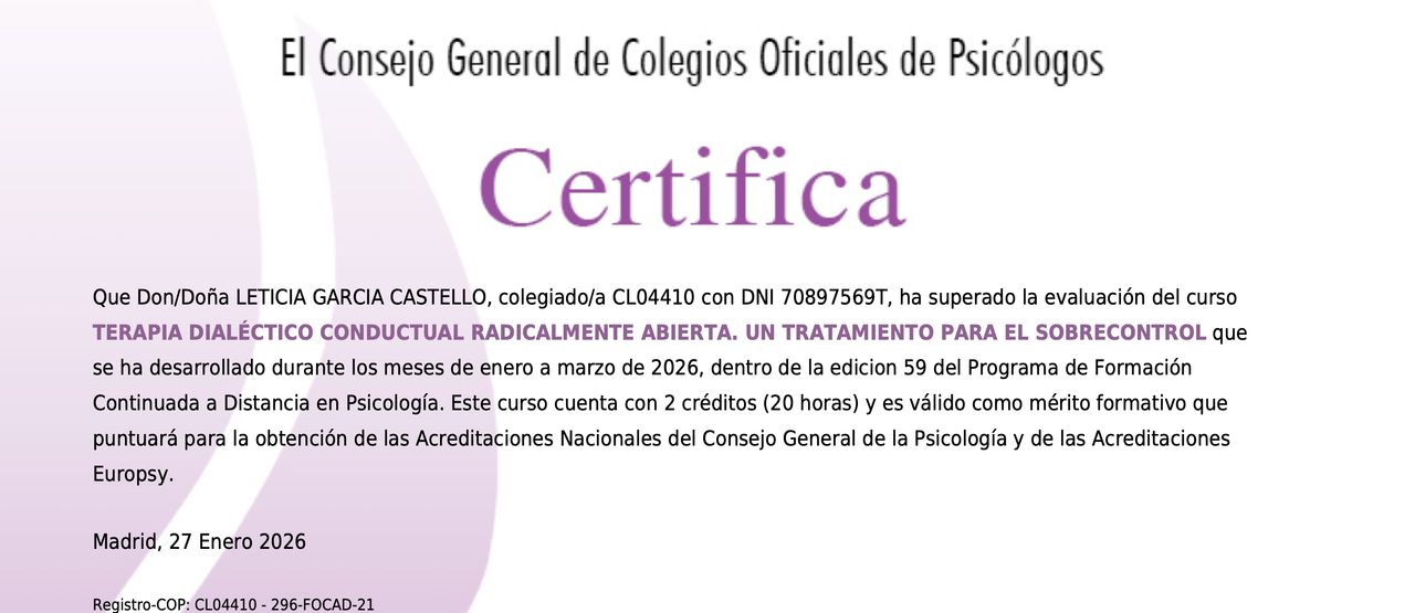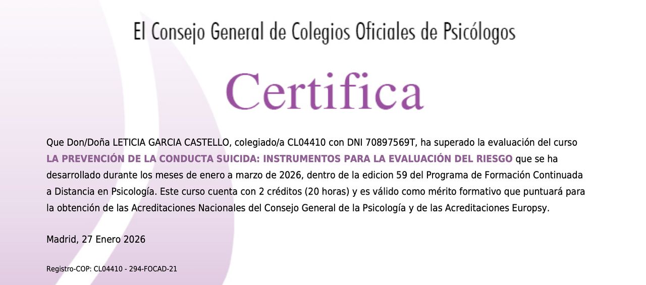 6)No se hacen devoluciones Muchas gracias por tu confianza. SOBRE MÍ: Me llamo Leticia, pero puedes llamarme Leti. Soy de Salamanca y adoro mi ciudad. Psicóloga sanitaria, sexóloga clínica, terapeuta de pareja, mediadora, orientadora familiar y formadora de élite. Especialista en relaciones interpersonales, dependencia emocional, problemas de la vida cotidiana, trabajo en equipo y crecimiento personal. La psicología y la sexología son mi pasión, crear hojas de ruta efectivas y ofrecer diferentes perspectivas que ayuden a lograr los objetivos de cada valiente luchador que confía en mí para ayudarle en su proceso, es lo que me más me motiva en mi día a día. MÉTODO CASTELLÓ: De mi experiencia profesional surge este proyecto, donde acompaño tanto a parejas, como a familias y particulares en sus procesos de cambio y desarrollo, derribando los muros que no les dejan avanzar, gestionando sus recursos de la manera más productiva y adquiriendo estrategias útiles y eficaces para afrontar sus dificultades. Puesto que mi línea de trabajo se dirige tanto a los procesos de cambio como a la docencia, he desarrollado un método propio basado en la evidencia científica, enfocado a la búsqueda de la excelencia y a la consecución del tipo de persona, pareja o familia que cada uno quiera ser, mediante sesiones personalizadas, cursos prácticos, talleres, charlas, podcast, psicoeducación y grupos de apoyo. GABINETE CASTELLÓ: Somos un EQUIPO que crece y actualmente contamos con 6 profesionales con diferentes especialidades para ayudaros a conseguir vuestros objetivos terapéuticos. Somos unas cracks tanto en PRESENCIAL EN SALAMANCA Y MADRID como en ON LINE. Nuestros 10 años de experiencia y subiendo nos avalan. MÉTODO DE TRABAJO: Eso si!!!! antes de poder ayudarte, voy a necesitar que me respondas unas PREGUNTAS ya que nosotras no somos un Gabinete genérico, somos un Gabinete especializado y necesitamos valorar si podemos ayudarte con tu problema. Si vas a hacer una inversión en tu salud, imagino que querrás profesionales especialistas en tu caso, verdad? Dicho lo cual, primero, yo como Directora del Gabinete conozco tu caso, en segundo lugar, valoramos los objetivos que quieres conseguir y por último (si somos las personas adecuadas para ayudarte) te planteo la mejor opción para ponernos manos a la obra y el profesional indicado para ayudarte. Por otro lado, prefiero hacer la sesión INFORMATIVA por antes de que empecéis a trabajar con nosotras ya que me gusta ser transparente y si decidís confiar en nosotras para ayudaros, quiero que sea sabiendo todo y así reducir la incertidumbre que surja y que valores si nuestra metodología es lo que estás buscando. Te comento el enfoque desde el que trabajamos y nuestro encuadre terapéutico y así puedes ver si nuestra forma cuadra con lo que necesitas, aunque para ir abriendo boca quiero que sepas que nuestra forma de trabajar es INTEGRATIVA, MULTIDISCIPLINAR, PROACTICA Y EXPERIENCIAL. Si tras esta comunicación hay feeling (fundamental entre terapeuta y paciente para el éxito de la terapia) te explicaría los siguientes pasos para empezar la terapia, los documentos necesarios....etc etc En las siguientes sesiones realizaremos una evaluación individualizada empleando una metodología adaptada a través de entrevista libre y/o semi estructurada, junto a la realización de pruebas psicométricas validadas. Tras esto, se establece una hipótesis de trabajo que se devuelve al paciente y a raíz de ésta, un plan de tratamiento personalizado. Por último, considero fundamental que haya continuidad en los procesos terapéuticos porque si no no tienen éxito, por ello para minimizar el impacto a nivel económico, contamos con diferentes BONOS. Para ampliar la información, contáctame sin compromiso por whatsapp estaré encantada de ayudarte.