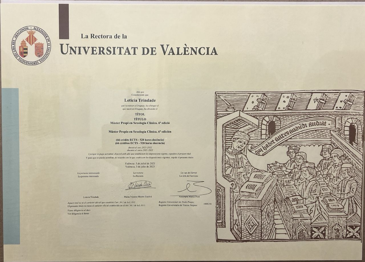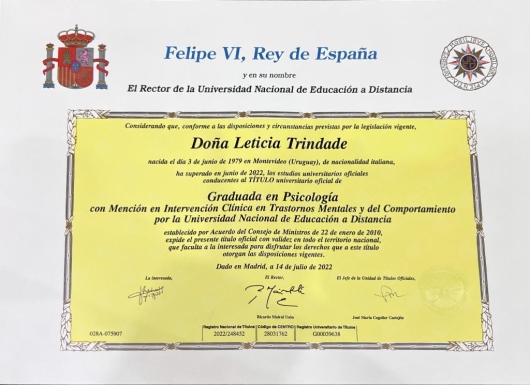 Cuento con Grado en Psicología, mención en Intervención Clínica en Trastornos Mentales y del Comportamiento, Máster en Psicología General Sanitaria, Máster en Sexología Clínica y Experto Universitario en Terapias Contextuales y de Tercera Generación.