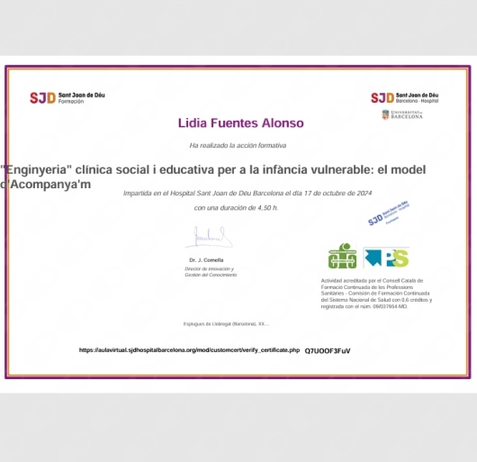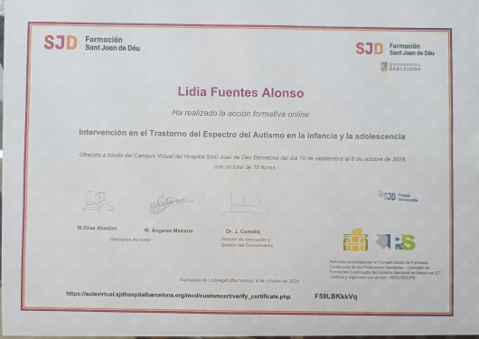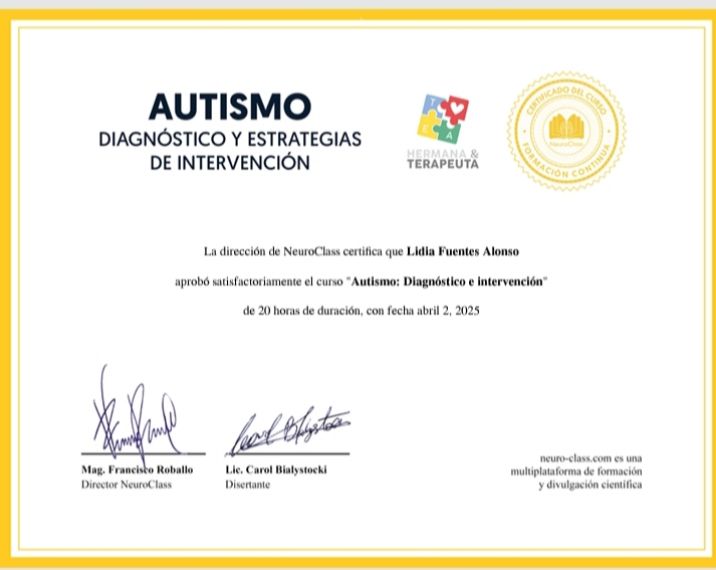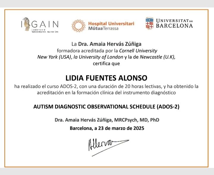 Dispongo de formación adicional en evaluación e intervención en neurodiversidades como TDAH, dislexia y autismo. Acreditación oficial en evaluación clínica de autismo mediante Ados-2.