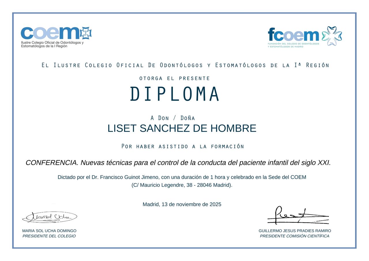 ¿Cuáles son las principales especialidades de Liset Sánchez de Hombre?Liset Sánchez de Hombre es dentista. Te mostramos algunos de los servicios que ofrece gracias a su trayectoria y amplia experiencia: Primera visita Odontología, Visitas sucesivas Odontología, Visita Odontología, Primera visita Odontología Pediátrica, Primera visita informativa gratuita, Primera Visita Ortodoncia, Visita Odontología Pediátrica, Visita de tratamiento, Visita de revisión, Limpieza dental.