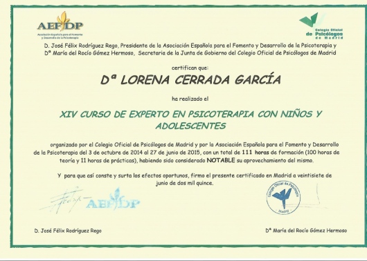 ¿Cuáles son las principales especialidades de LORENA CERRADA GARCIA?LORENA CERRADA GARCIA es psicóloga, psicóloga infantil. Te mostramos algunos de los servicios que ofrece gracias a su trayectoria y amplia experiencia: Primera visita Psicología, Cita informativa, TERAPIA PAREJA, Diagnóstico y atención de las altas capacidades, Consulta de Psicología Sanitaria, Tratamiento para trastornos infanto-juveniles, Terapia familiar, Técnicas y estrategias de autoestima, Desensibilización sistemática, Diagnóstico y tratamiento para la depresión.