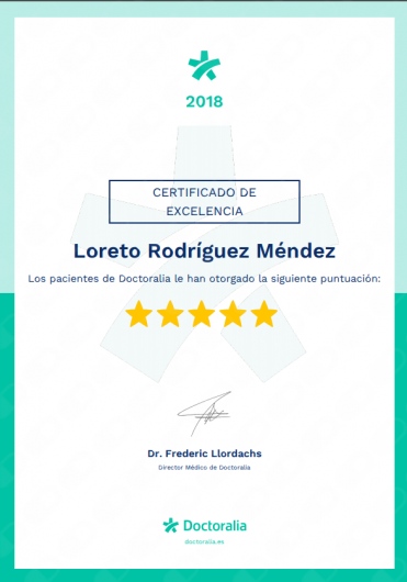 ¿Qué opinan los pacientes de Loreto Rodríguez Méndez?Un total de 31 pacientes han querido dejar una opinión sincera y real sobre Loreto Rodríguez Méndez, otorgándole además una valoración media de 5 estrellas (sobre un máximo de 5).