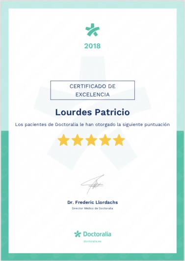 ¿Cómo puedo reservar una cita con Lourdes Patricio?El calendario que muestra Lourdes Patricio en Doctoralia está actualizado en tiempo real, por lo que solo tienes que elegir qué día y hora te va mejor de entre las disponibles. La reserva es gratuita, y además recibes un recordatorio antes de la visita.