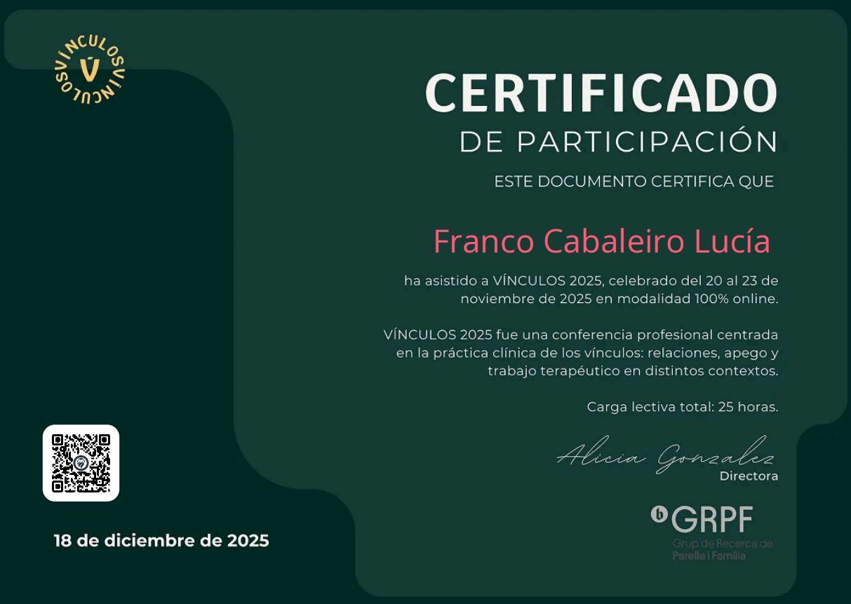 ¿Cuáles son las principales especialidades de Lucía Franco Cabaleiro?Lucía Franco Cabaleiro es psicóloga. Te mostramos algunos de los servicios que ofrece gracias a su trayectoria y amplia experiencia: Primera visita Psicología, Visita sucesiva psicología, Consulta online.