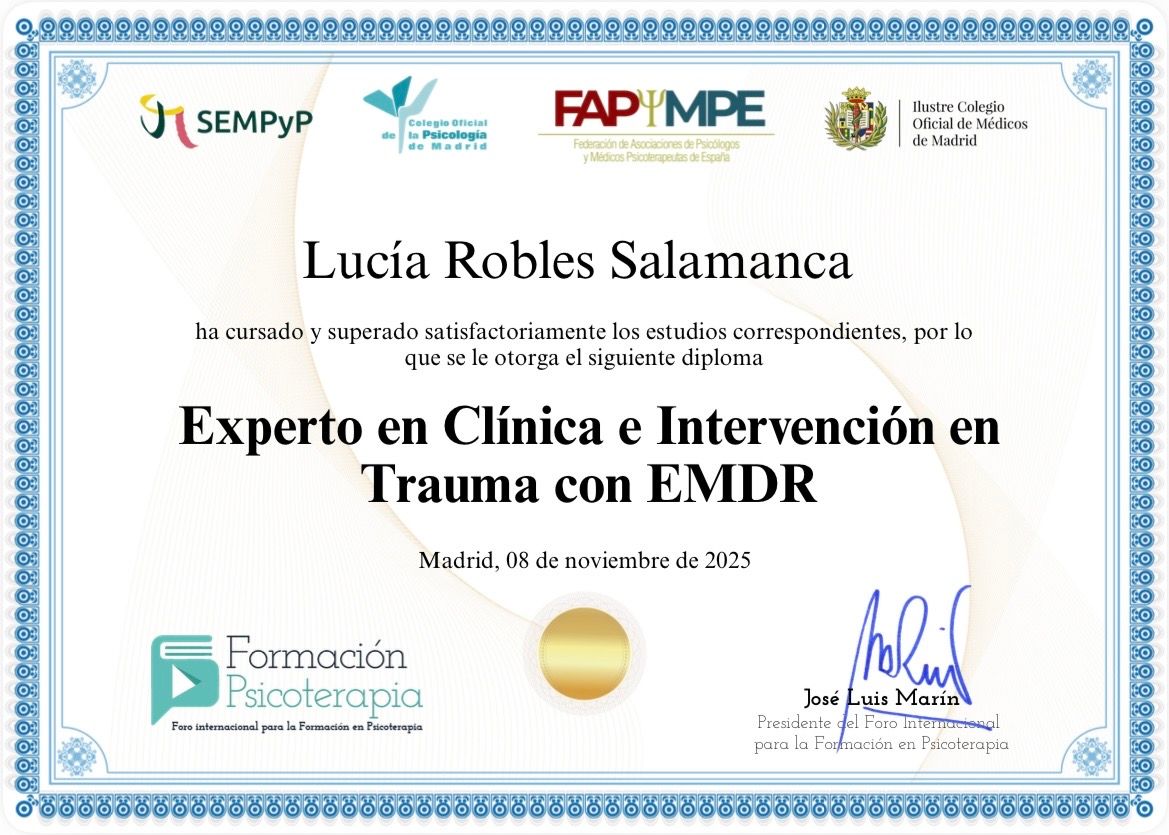 Soy Lucía, Psicóloga General Sanitaria, especializada en terapia sistémica, en el acompañamiento de personas con Trastorno del Espectro del Autismo (TEA), en el ámbito infanto-juvenil y experta en Clínica e Intervención en Trauma con EMDR.