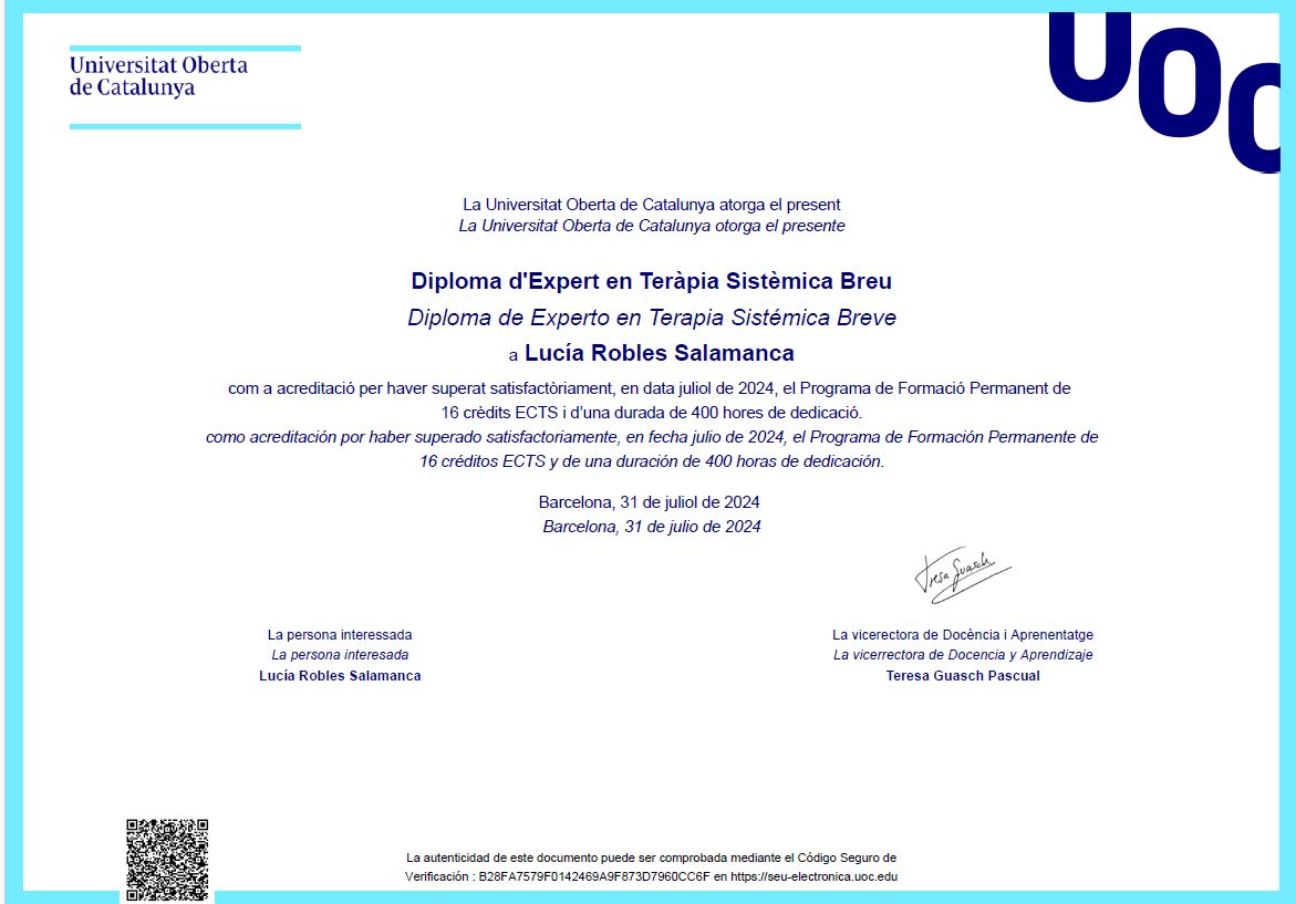 ¿Cuáles son las principales especialidades de Lucía Robles Salamanca?Lucía Robles Salamanca es psicóloga. Te mostramos algunos de los servicios que ofrece gracias a su trayectoria y amplia experiencia: Consulta online, Consulta psicológica online, Gestión del estrés, Primera visita Psicología, Psicología infantil, Psicología online, Psicoterapia, Psicoterapia en adolescentes, Psicoterapia individual, Técnicas y estrategias de autoestima.