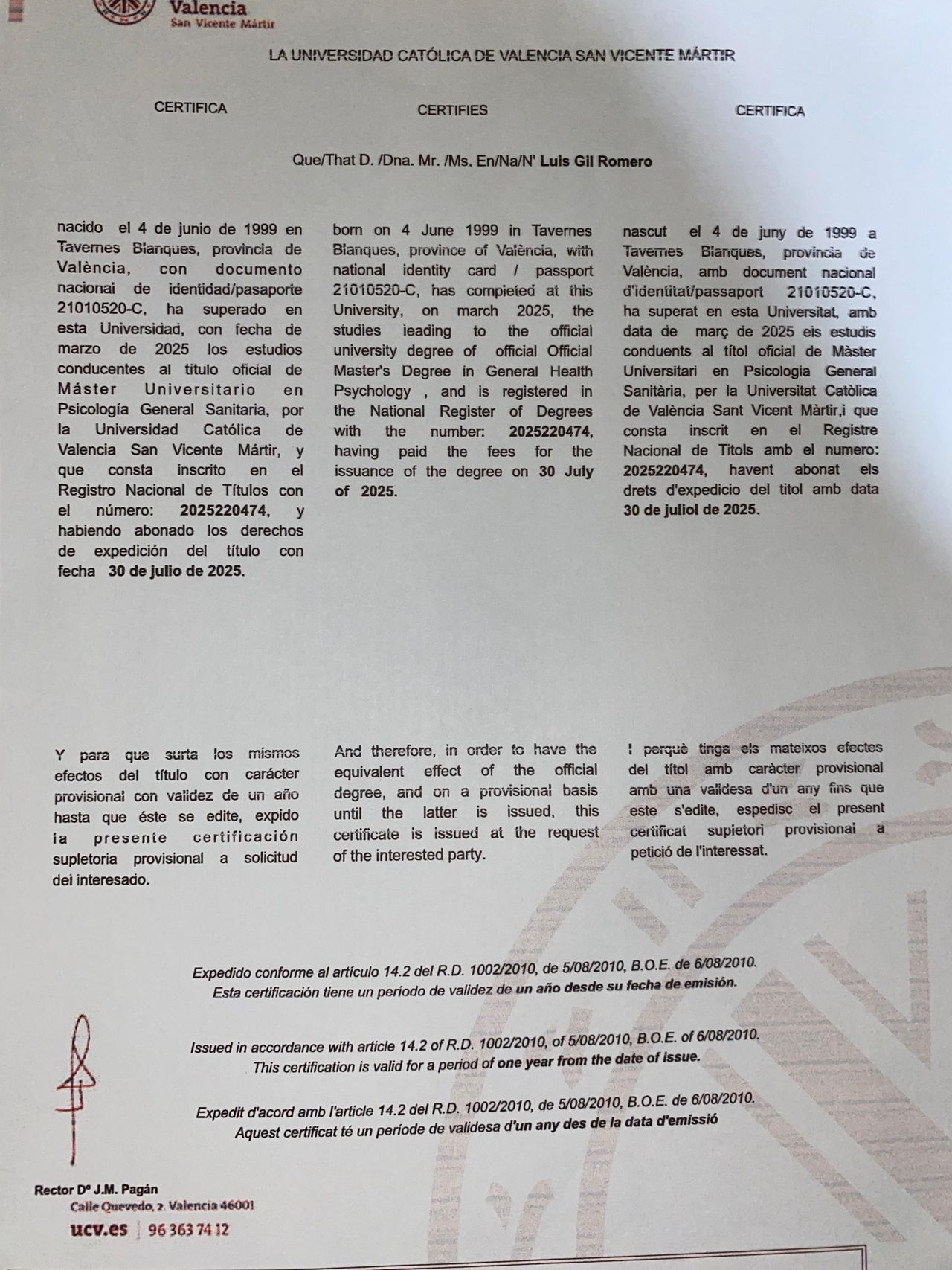 Soy graduado en Psicología por la Universidad de Valencia y Máster en Psicología General Sanitaria por la Universidad Católica de Valencia. Además, cuento con formación específica en el abordaje sistémico del apego y el trauma, lo que me permite trabajar cómo las experiencias pasadas influyen en el bienestar emocional actual.