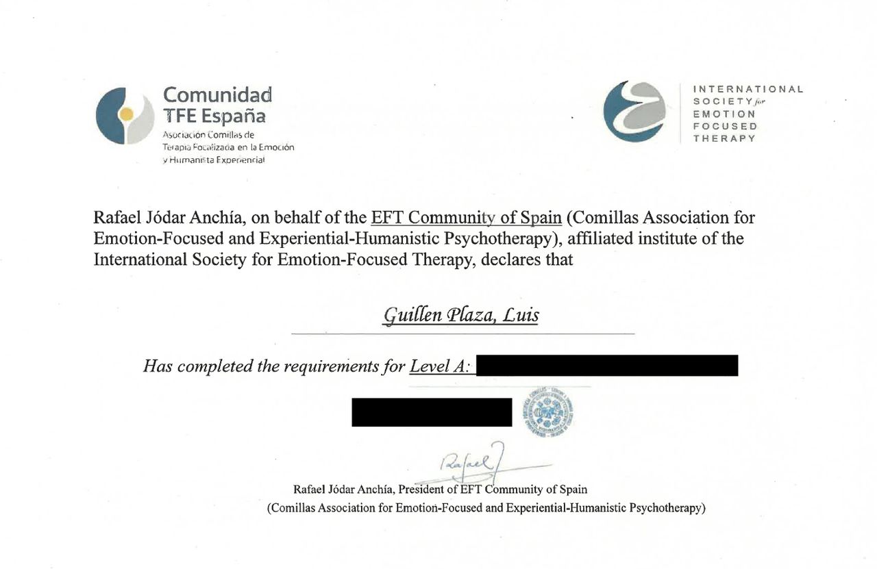 Soy Luis Guillén Plaza, psicólogo general sanitario colegiado (M-40260), con doble mención en psicología de la salud y psicología del trabajo. Soy especialista en terapia de pareja, terapia sexual, educación sexual y en terapia focalizada en la emoción.