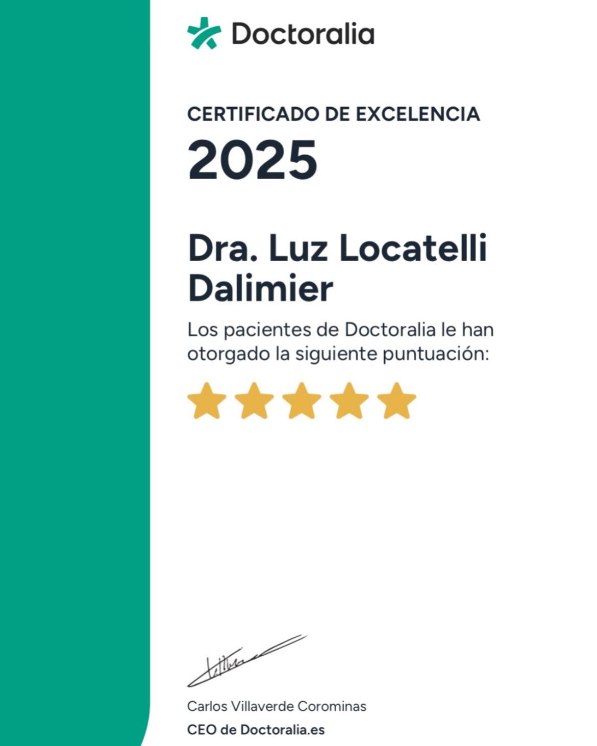 ¿Qué opinan los pacientes de Luz Locatelli Dalimier?Un total de 31 pacientes han querido dejar una opinión sincera y real sobre Luz Locatelli Dalimier, otorgándole además una valoración media de 5 estrellas (sobre un máximo de 5).
