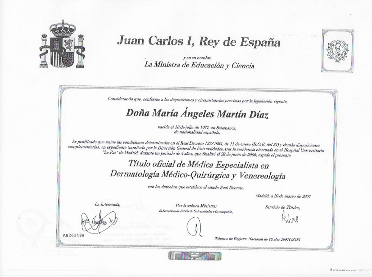La Dra. María Ángeles Martín Díaz, Jefe de Servicio del Hospital Universitario Infanta Leonor de Madrid, es una especialista en dermatología, que cuenta con amplia experiencia en la profesión, y una extensa formación en diferentes campos de la especialidad.