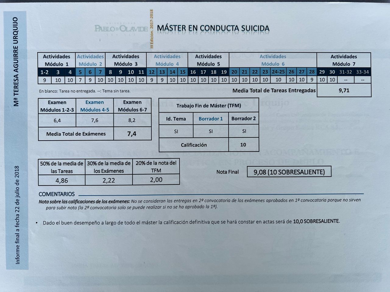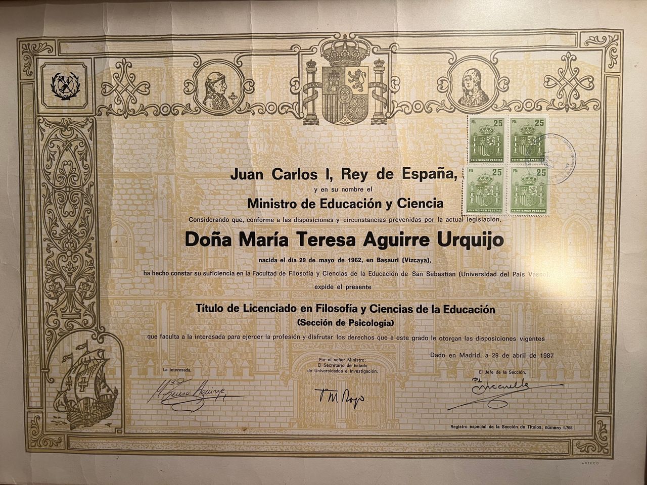 Soy Teresa Aguirre y me siento honrada de formar parte de esta nueva etapa en tu vida. Soy psicóloga con acreditación sanitaria y número de colegiada BI00568. Te ofrezco un espacio seguro de acompañamiento en tu proceso de mejora donde no se juzga nada ni a nadie. Donde lo importante eres "TU" y tu objetivo de mejora. A lo largo de mi experiencia profesional he apoyado a muchas personas a mejorar su salud mental: duelos, miedos, bienestar emocional, su autoimagen y autovaloración, aprender a gestionar sus emociones, y, en definitiva, aumentar su crecimiento personal, siempre desde un clima íntimo y cercano. Creo firmemente en el potencial que tienen las personas a la hora de lograr grandes cambios en sus vidas y superarse ya que todas y cada una de las personas pasamos por baches en nuestro día a día (algo muy, muy normal). Lo que me mueve a acompañarte en este proceso, es el deseo de servir como guía/entrenador@ en este camino que se inicia, que requerirá esfuerzos y confianza, pero en el que al final encontrarás esa sensación de bienestar tan deseada 2 UNA VIDA QUE MEREZCA LA PENA VIVIR". Para ello, procuro siempre trabajar desde la naturalidad, calidez y confianza mutua, poniendo una mirada positiva en todos los logros que vamos a conseguir gracias a un trabajo conjunto. Para ello cuento con Formación en Terapia Relacional (vincular) y Terapias de Tercera Generación todo con perspectiva de género; así como Masters en, Violencia de Género, Suicidio, Psicoterapia emocional y Expertos en Depresión y Ansiedad, Psicología Clínica, Intervención en Trauma y EMDR además de Experto en Intervenciones Terapéuticas con Mindfulness y Coach Psicológico. Por último, en mi vida, disfruto viajando, conociendo nuevos lugares, historia, personas y formas de comprender el mundo que nos rodea, considero que es, junto con la psicología, de las actividades que más me enriquecen a nivel personal. Me relajo haciendo rutas de senderismo y danza, me divierte innovar y probar nuevas expresiones de mi emocionalidad. Además, me considero amante de los animales, tan importantes también para las personas.