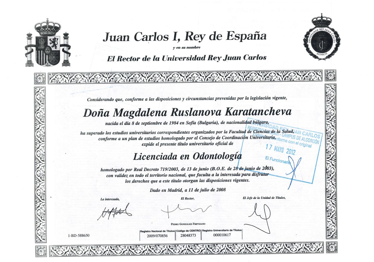 ¿Cuáles son las principales especialidades de Magdalena Ruslanova Karatancheva?Magdalena Ruslanova Karatancheva es dentista. Te mostramos algunos de los servicios que ofrece gracias a su trayectoria y amplia experiencia: Primera visita Odontología, Reconstrucción dental, Endodoncia, Mantenimiento periodontal, Exodoncia, Extracción de muela del juicio, Coronas de zirconio y porcelana, Férula de descarga, Curetaje dental.