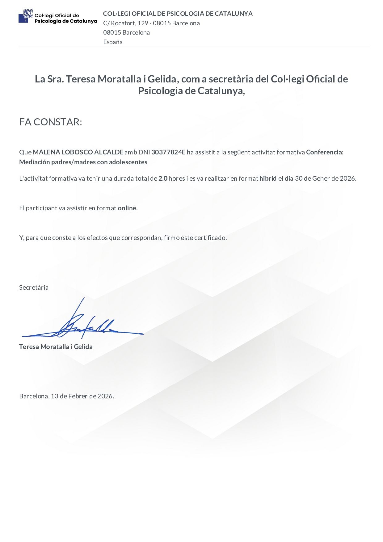 ¿Puedo hacer la visita con Malena Lobosco Alcalde de forma online, sin tener que desplazarme hasta su consulta?Sí, Malena Lobosco Alcalde ofrece consulta de forma remota. Solo tienes que seleccionar "consulta online" cuando vayas a reservar cita desde el calendario, y así podrás ver las fechas y horas disponibles.