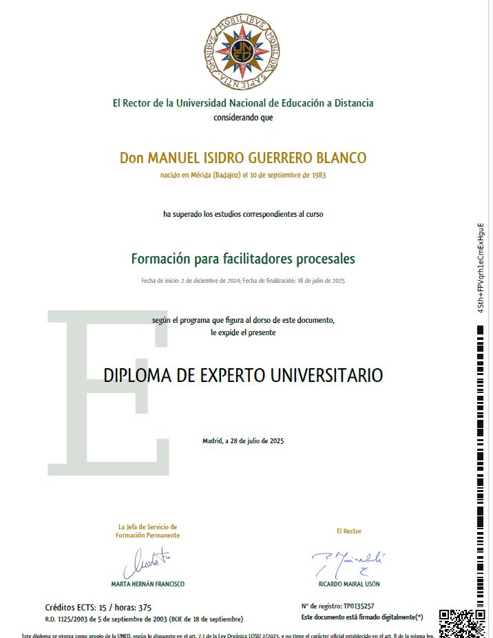He obtenido el Diploma de Experto Universitario en Formación para Facilitadores Procesales, expedido por la Universidad Nacional de Educación a Distancia (UNED).