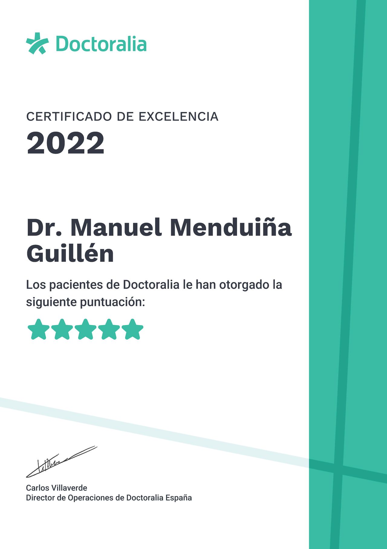 ¿Qué opinan los pacientes de Manuel Menduiña Guillén?Un total de 271 pacientes han querido dejar una opinión sincera y real sobre Manuel Menduiña Guillén, otorgándole además una valoración media de 5 estrellas (sobre un máximo de 5).