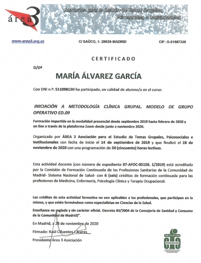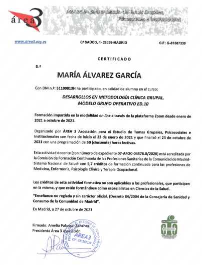 Estoy diagnosticada de depresión mayor y ansiedad crónica. He tenido terapia de grupo con María durante un año en el HCSC. María tiene el don de la normalidad, siempre aporta un poco de luz que te hace reflexionar cosas de tu día a día. Es una persona muy íntegra y con valores muy ordenados. A mí me ha aportado mucho este año