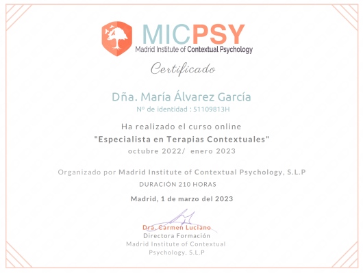 ¿Cuáles son las principales especialidades de María Álvarez García?María Álvarez García es psicóloga. Te mostramos algunos de los servicios que ofrece gracias a su trayectoria y amplia experiencia: Consulta online, Acompañamiento psicológico en el proceso personal, Acompañamiento emocional, Psicodiagnóstico para adultos, Diagnóstico y tratamiento de los trastornos depresivos, Diagnóstico y tratamiento para trastornos de ansiedad, Diagnóstico y tratamiento de los trastornos alimentarios, Diagnóstico y tratamiento para la depresión, Psicoterapia psicoanalítica, Terapias contextuales/ de tercera generación.
