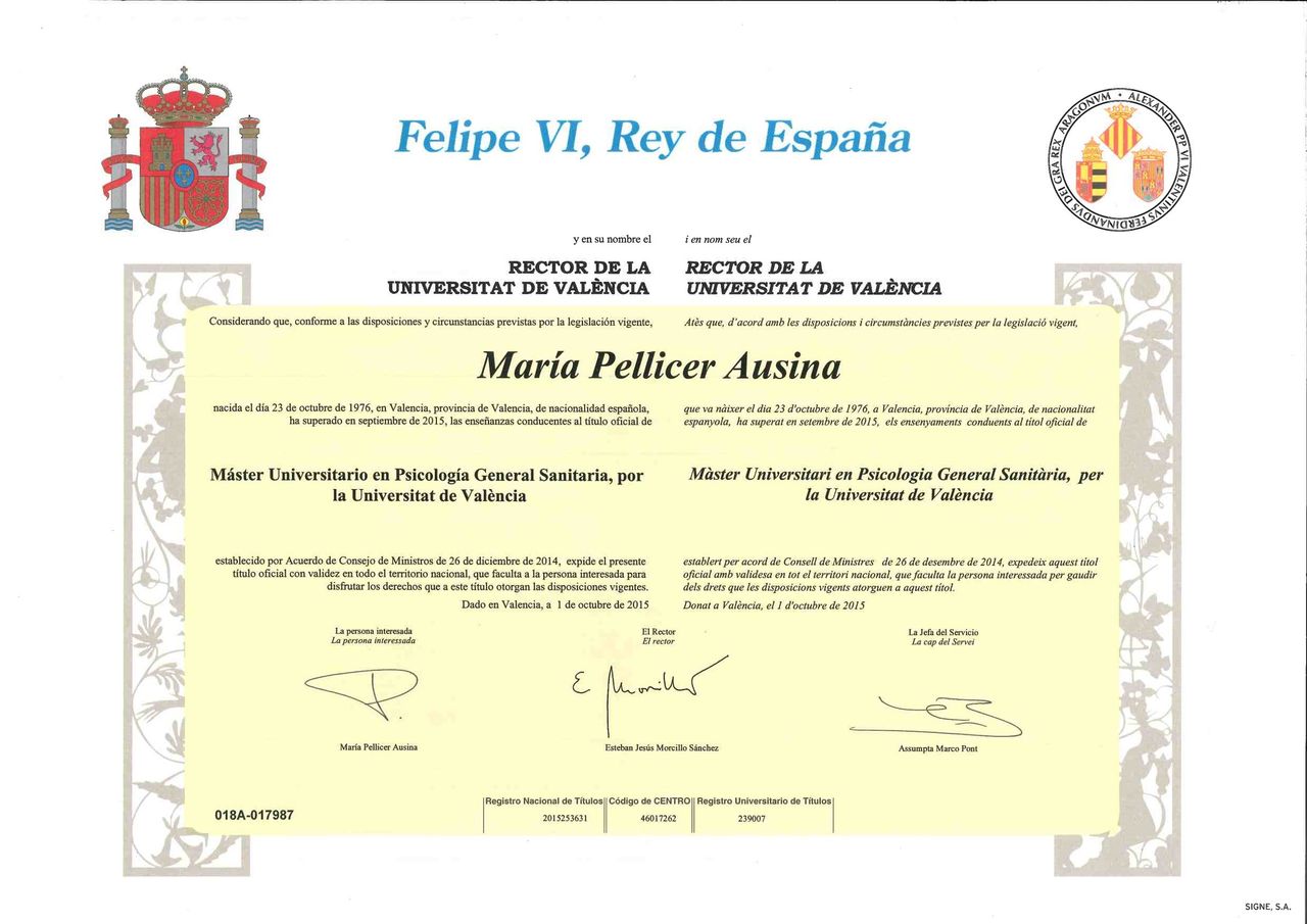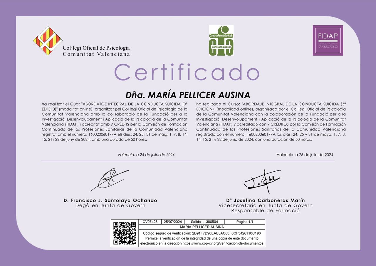 Soy psicóloga general sanitaria y desde 2015 trabajo en consulta privada, acompañando a personas en momentos de dificultad emocional o de cambio personal. Atiendo a jóvenes, personas adultas y mayores de forma presencial en Valencia y también online.