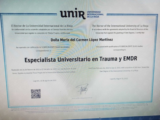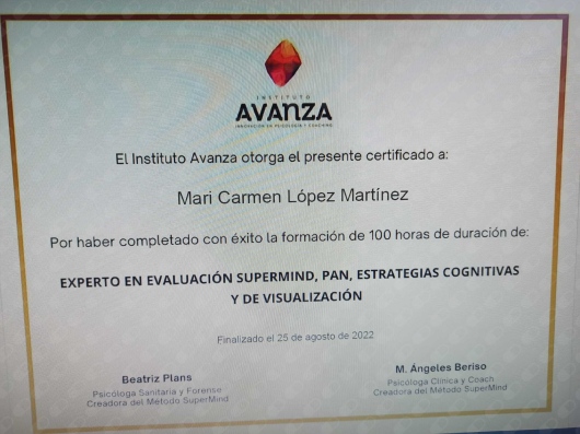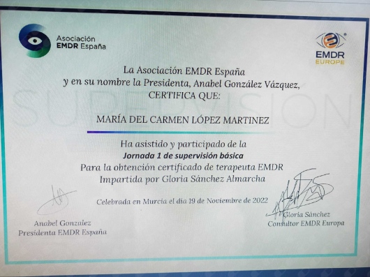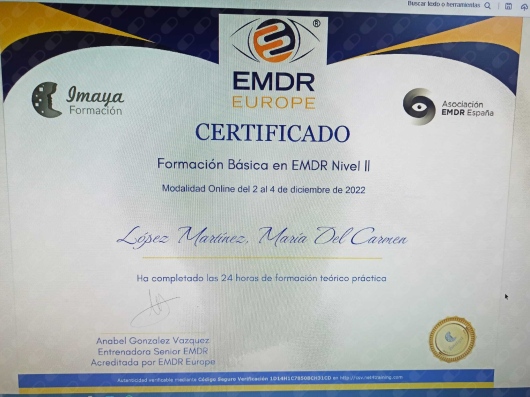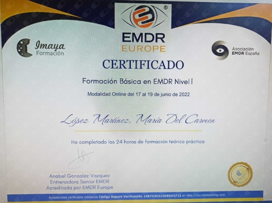 ¿Cuáles son las principales especialidades de Maria Carmen López?Maria Carmen López es psicóloga. Te mostramos algunos de los servicios que ofrece gracias a su trayectoria y amplia experiencia: Primera visita Psicología, Terapia con EMDR, Entrenamiento en Relajación Muscular Progresiva, Relajación, Visitas sucesivas Psicología, Terapia con caja de arena, Activación conductual para la depresión, Apoyo psicológico en traumas por dependencia emocional, Desarrollo y crecimiento personal, Mindfulness.