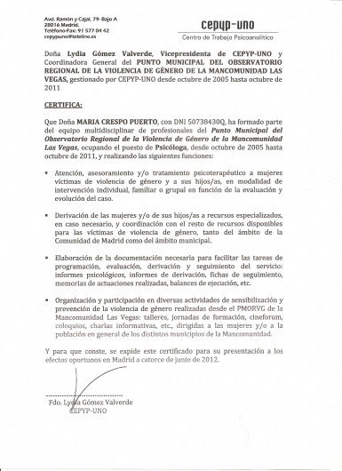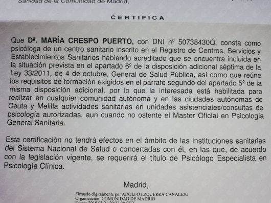 ¿Cuáles son las principales especialidades de María Crespo Puerto?María Crespo Puerto es psicóloga. Te mostramos algunos de los servicios que ofrece gracias a su trayectoria y amplia experiencia: Terapia individual, Orientación en la crianza de los hijos, Consulta de Psicología Sanitaria, Psicoanálisis, Asistencia psicológica a mujeres víctimas de violencia de género, Primera visita Psicología, Atencion psicológica infantil, Consulta psicológica online, Consulta online.