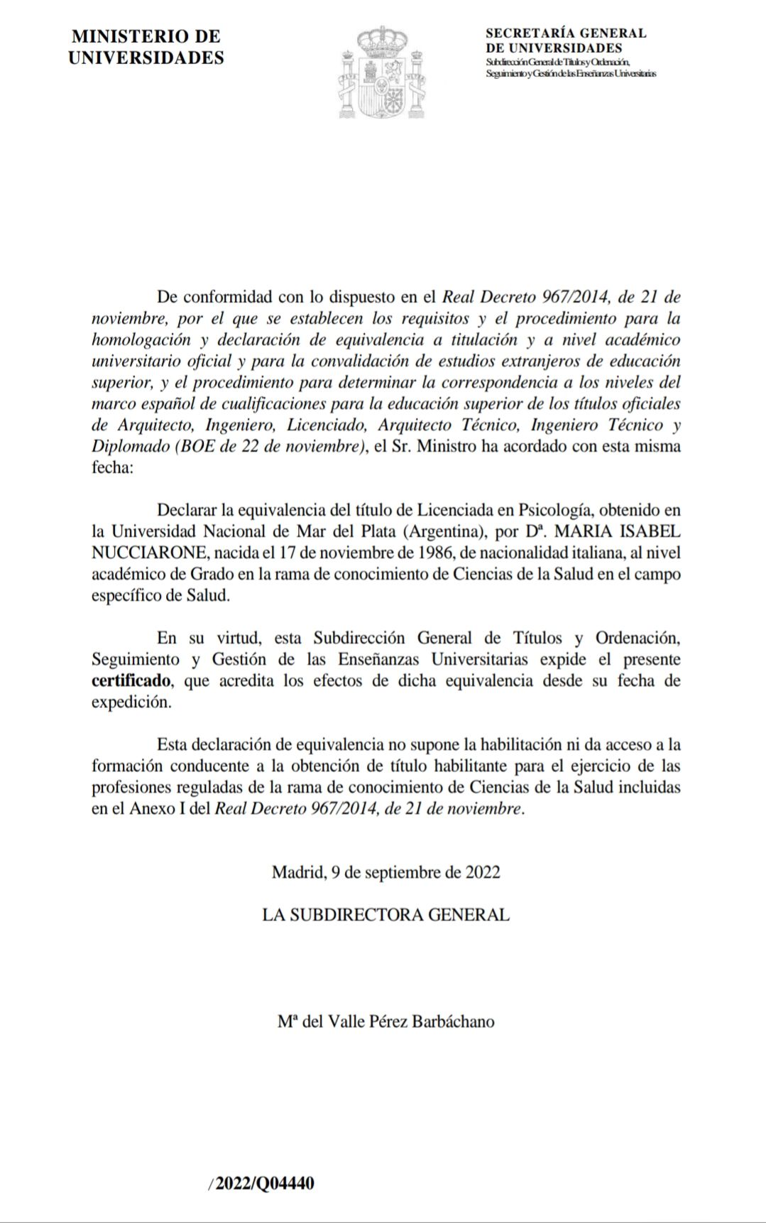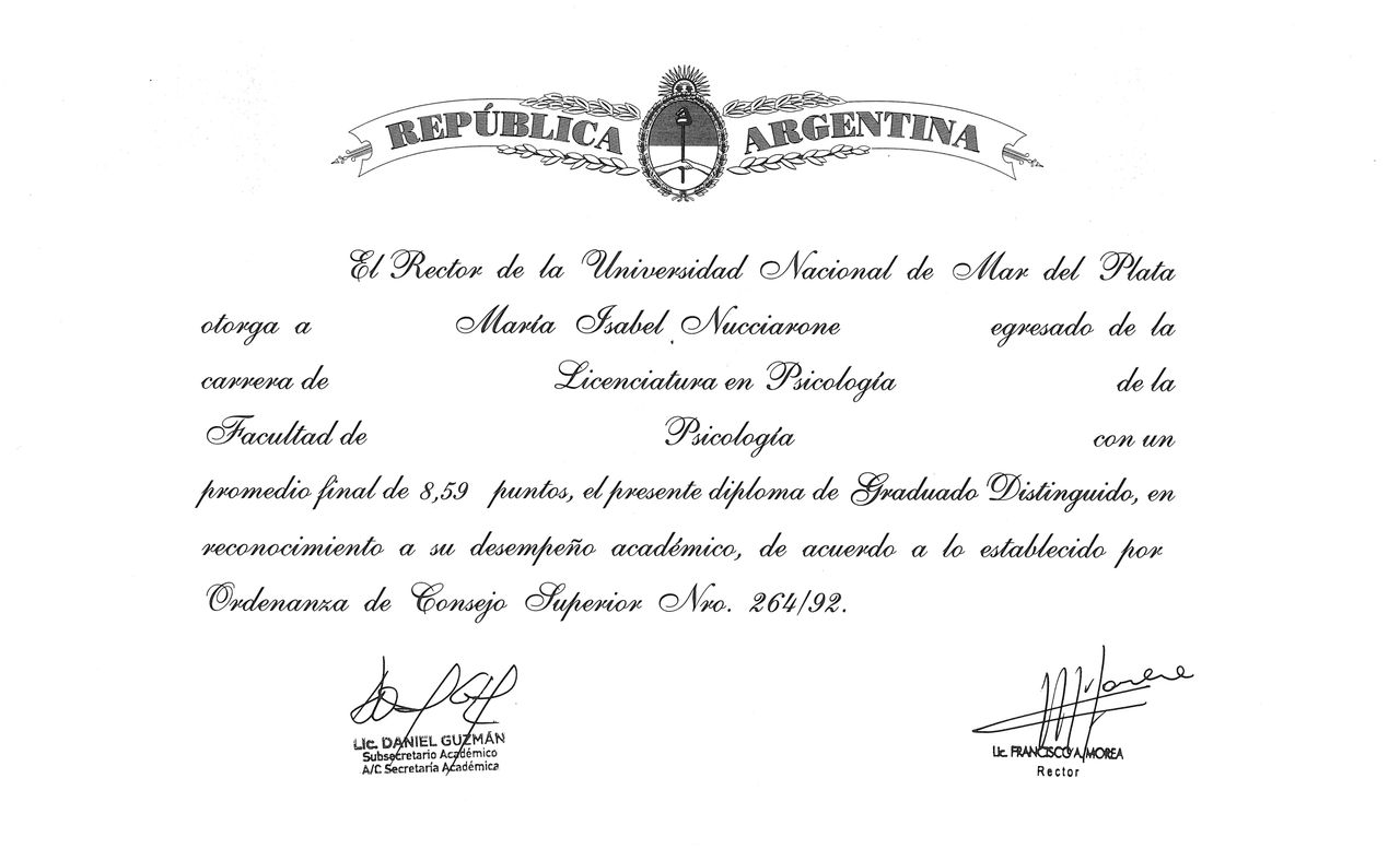 ¿Cuáles son las principales especialidades de Maria Isabel Nucciarone?Maria Isabel Nucciarone es psicóloga. Te mostramos algunos de los servicios que ofrece gracias a su trayectoria y amplia experiencia: Primera visita Psicología, Consulta psicoterapia de pareja, Psicoterapia integradora, Psicoterapia psicoanalítica, Psicoterapia Gestalt, Psicoterapia familiar, Psicoterapia familiar sistémica, Psicoterapia, Consulta online, Psicooncología.