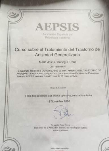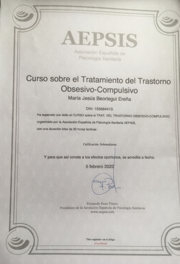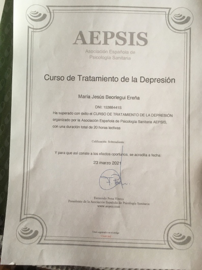 ¿Cuáles son las principales especialidades de María Jesús Beorlegi Ereña?María Jesús Beorlegi Ereña es psicóloga. Te mostramos algunos de los servicios que ofrece gracias a su trayectoria y amplia experiencia: Consulta online, Tratamiento para trastorno del estado de ánimo, Primera visita Psicología, Evaluación, diagnóstico y tratamiento del trastorno de pánico (con o sin agorafobia), Tratamiento en autoestima (sesiones online), Desarrollo y crecimiento personal, Acompañamiento emocional, Tratamiento depresión (sesiones online), Diagnóstico y tratamiento de los trastornos depresivos, Acompañamiento psicológico en el proceso personal.