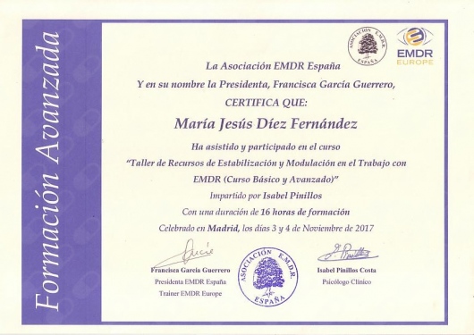 ¿Cuáles son las principales especialidades de María Jesús Díez Fernández?María Jesús Díez Fernández es psicóloga, terapeuta complementaria. Te mostramos algunos de los servicios que ofrece gracias a su trayectoria y amplia experiencia: Consulta online, Coaching personal, Inoculación del estrés, Técnicas y estrategias de autoestima, Primera visita Psicología, Terapia con EMDR, Terapia de duelo, Terapia online, Consulta de Psicología Sanitaria, Estrategias terapéuticas en comunicación y habilidades sociales.