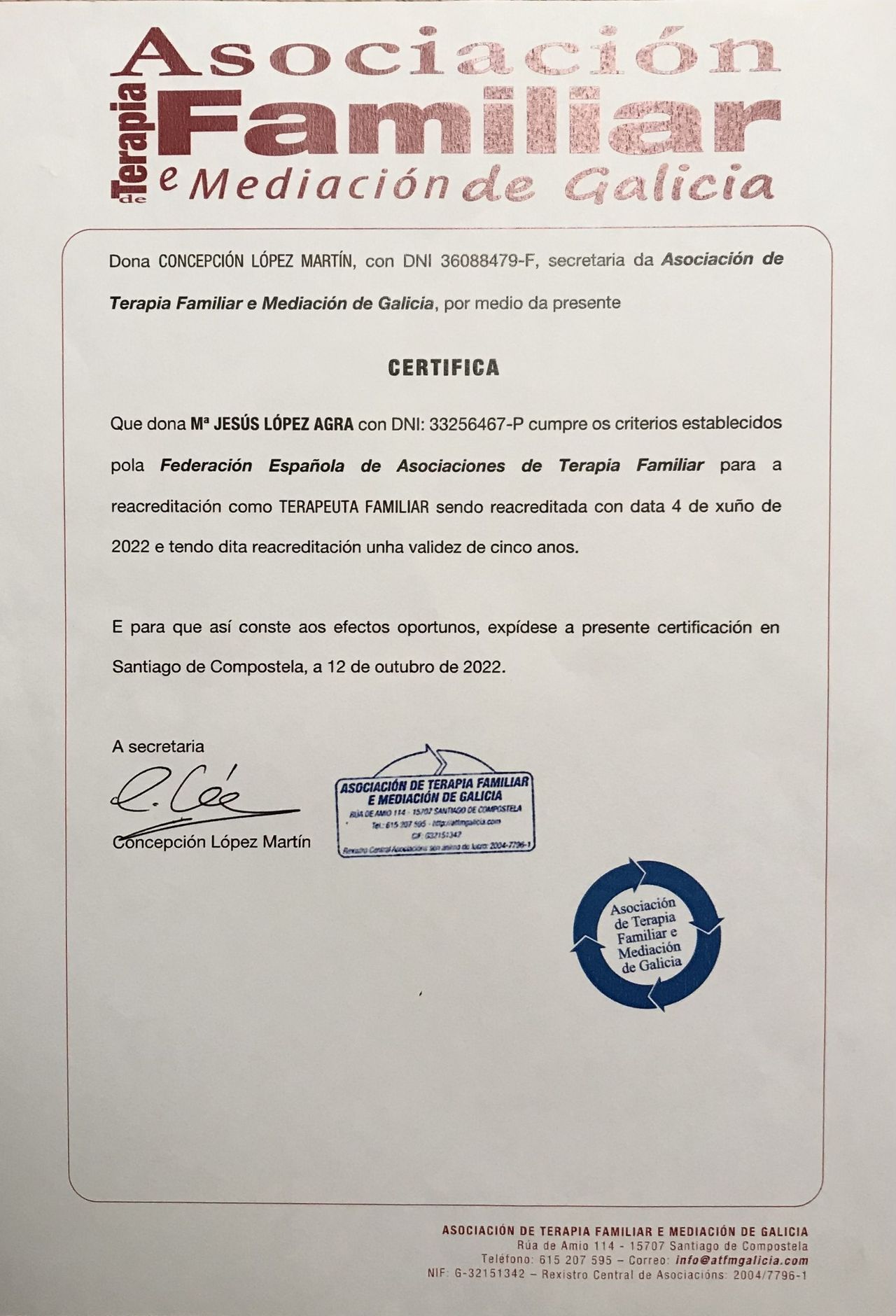 Actualmente soy la Vicepresidenta de la Asociación de Terapia Familiar y Mediación de Galicia.