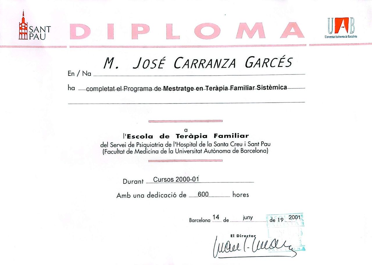 Psicóloga Clinica y Master en terapia familiar (UA de barcelona) con 30 años de experiencia. Terapeuta de Familia/ pareja /individual mediante la terapia de EMDR/EFT/MATRIX REIMPRINTING y CONSTELACIONES FAMILIARES