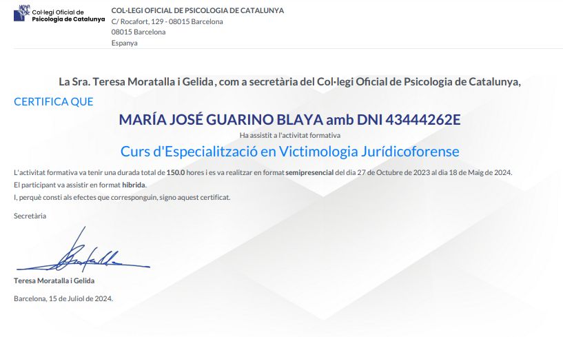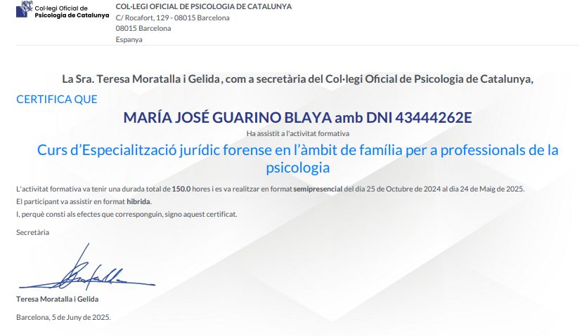 ¡Hola! Soy Maria José, Psicóloga Forense y con Master en Psicología de la Salud, Psicopedagoga y Educadora Social. Soy experta en violencias de género, violencia vicaria, maltrato, violencias filioparentales y problemas de crianza derivados de separaciones conflictivas. Trabajo en el diagnóstico y la psicoterapia de las relaciones tóxicas, la dependencia emocional, la autoestima y cualquier forma de abuso y maltrato, incluido el abuso narcisista. También trabajo en el ámbito de las separaciones de pareja conflictivas. Muchos hijos-as víctimas de maltrato tienen graves secuelas derivadas del abuso recibido, del conflicto o la violencia entre las partes y muchas veces acaban diagnosticados de TDAH, trastorno negativista desafiante, depresión, ansiedad... Realizo informes periciales psicológicos. Trabajo también como psicopedagoga también en el ámbito de las reeducaciones. Doy formación y realizo sesiones de supervisión a equipos.