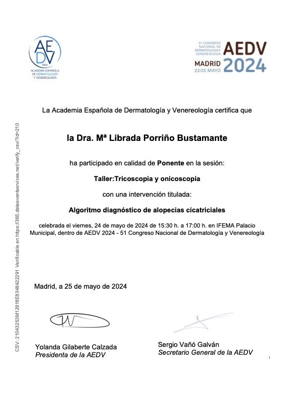 También tengo experiencia en tricología, que es el campo de la dermatología que se encarga del estudio del pelo y sus enfermedades. De hecho, realicé mi tesis doctoral sobre alopecia, concretamente sobre alopecia frontal fibrosante, que es un tipo muy frecuente de alopecia cicatricial.