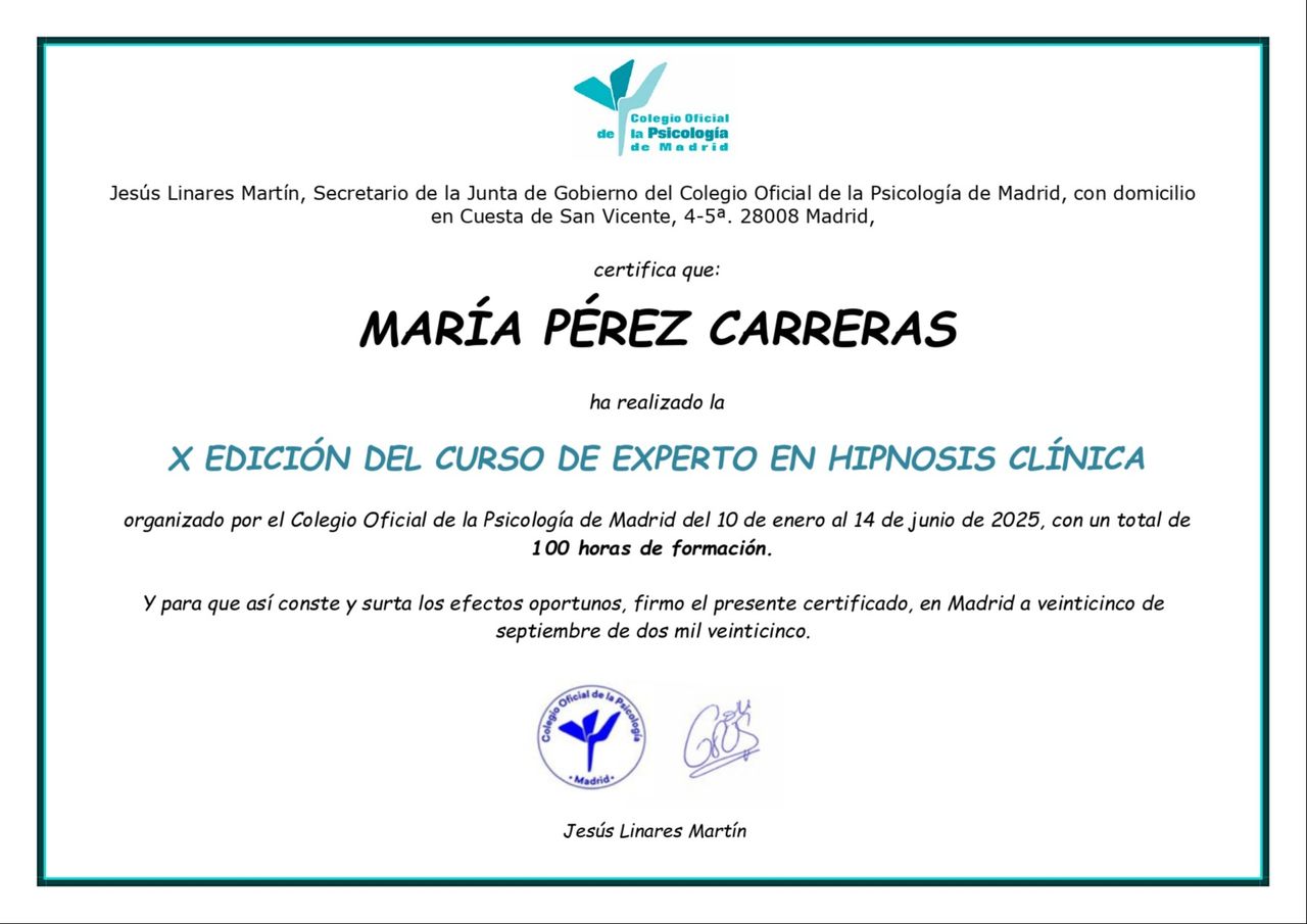 María es una persona que te acompaña en el camino, que respeta tus tiempos y te ayuda a ver aquello que no veías. Cada sesión es muy dedicada y te da esa confianza de estar hablando con una verdadera profesional. Sin duda la recomendaría siempre.