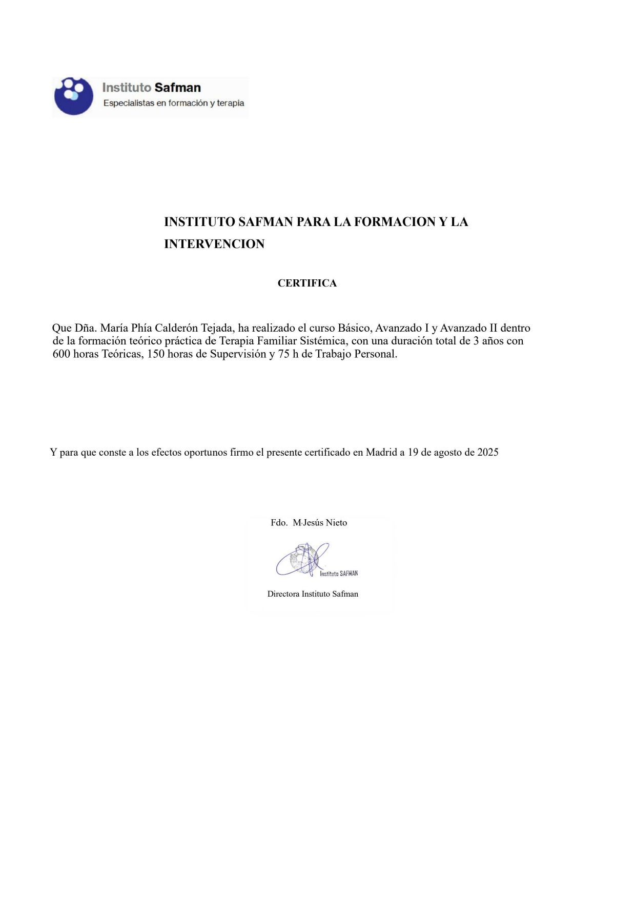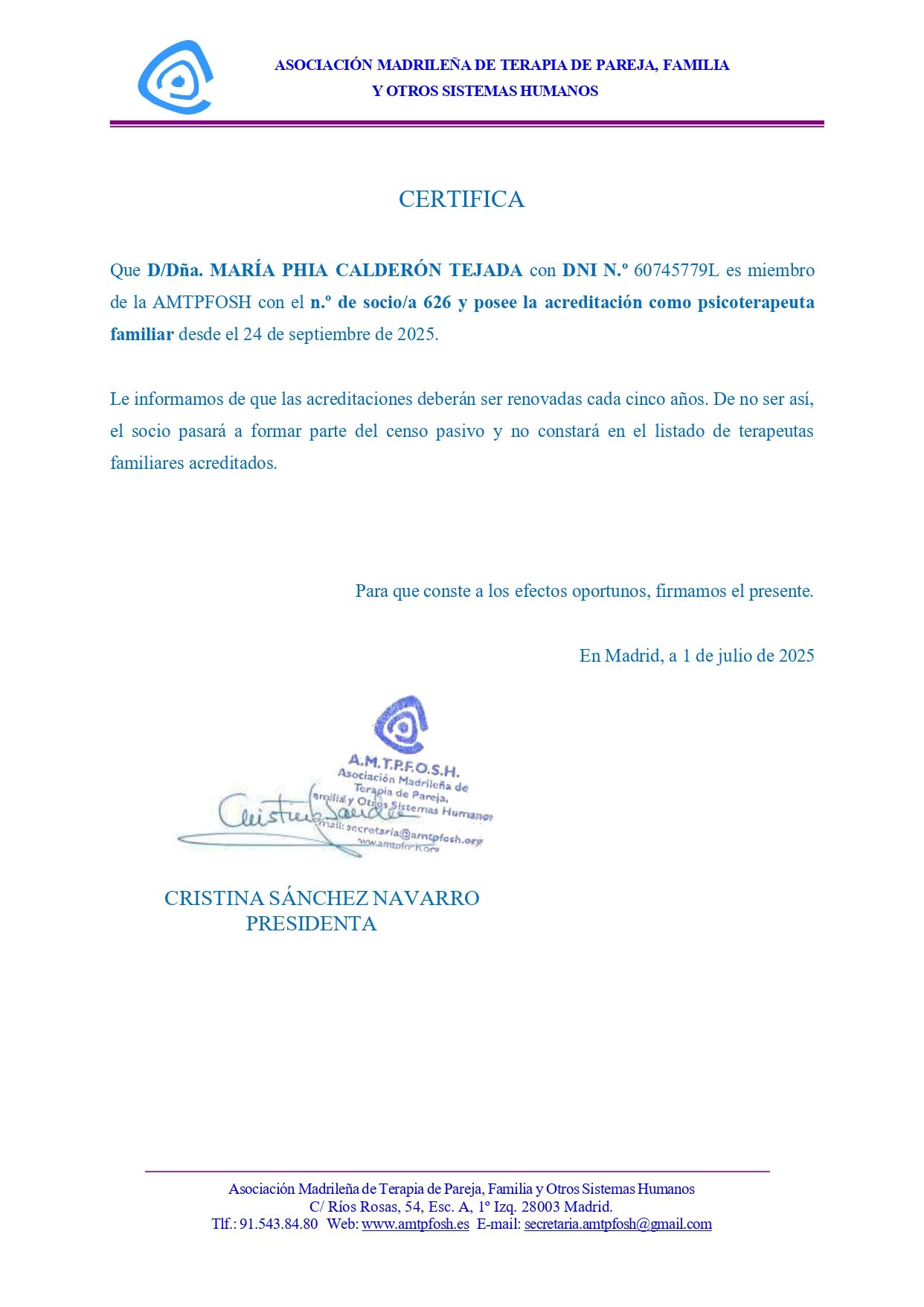 Soy psicóloga en proceso de homologación con Máster en Psicoterapia Familiar y de Parejas y miembro de la Asociación Madrileña de Terapia de Pareja y Familia.