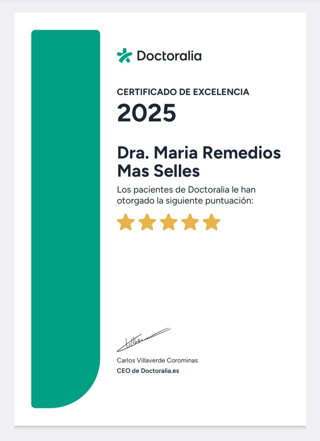 ¿Para cuándo podría visitarme con Maria Remedios Mas Selles?A veces Maria Remedios Mas Selles tiene algunas horas disponibles dentro de la misma semana o para la siguiente. Consulta su calendario: verás la primera hora que tiene disponible, ya que se actualiza en tiempo real. Si no te va bien esa primera hora, comprueba otros días. La reserva siempre es inmediata y gratuita.