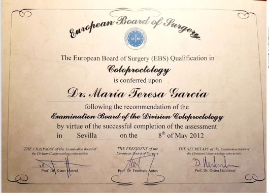 En el año 2012 obtuvo el título Board Europeo en Coloproctología, siendo el primer cirujano en Galicia en ostentar dicha titulación. Además, es miembro de las siguientes sociedades médicas: Asociación de Coloproctología de Gran Bretaña e Irlanda, Sociedad de Suelo Pélvico de Reino Unido, Sociedad Americana de Cirujanos Colorrectales y es vocal en el Comité Europeo de la Sociedad Internacional de Neoplasia Anal.